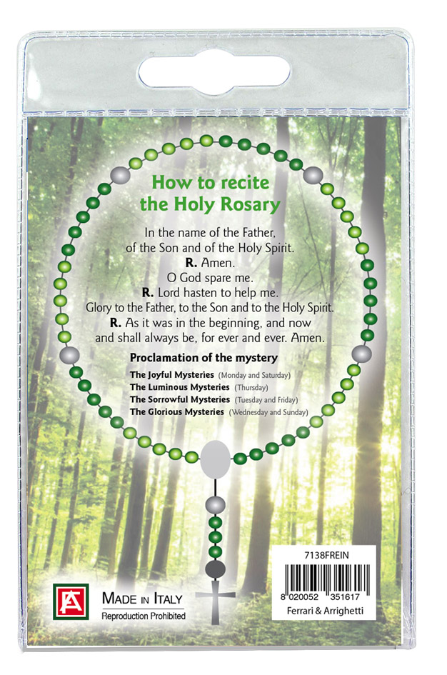 Sul retro del cartoncino è spiegato come si recita il rosario.