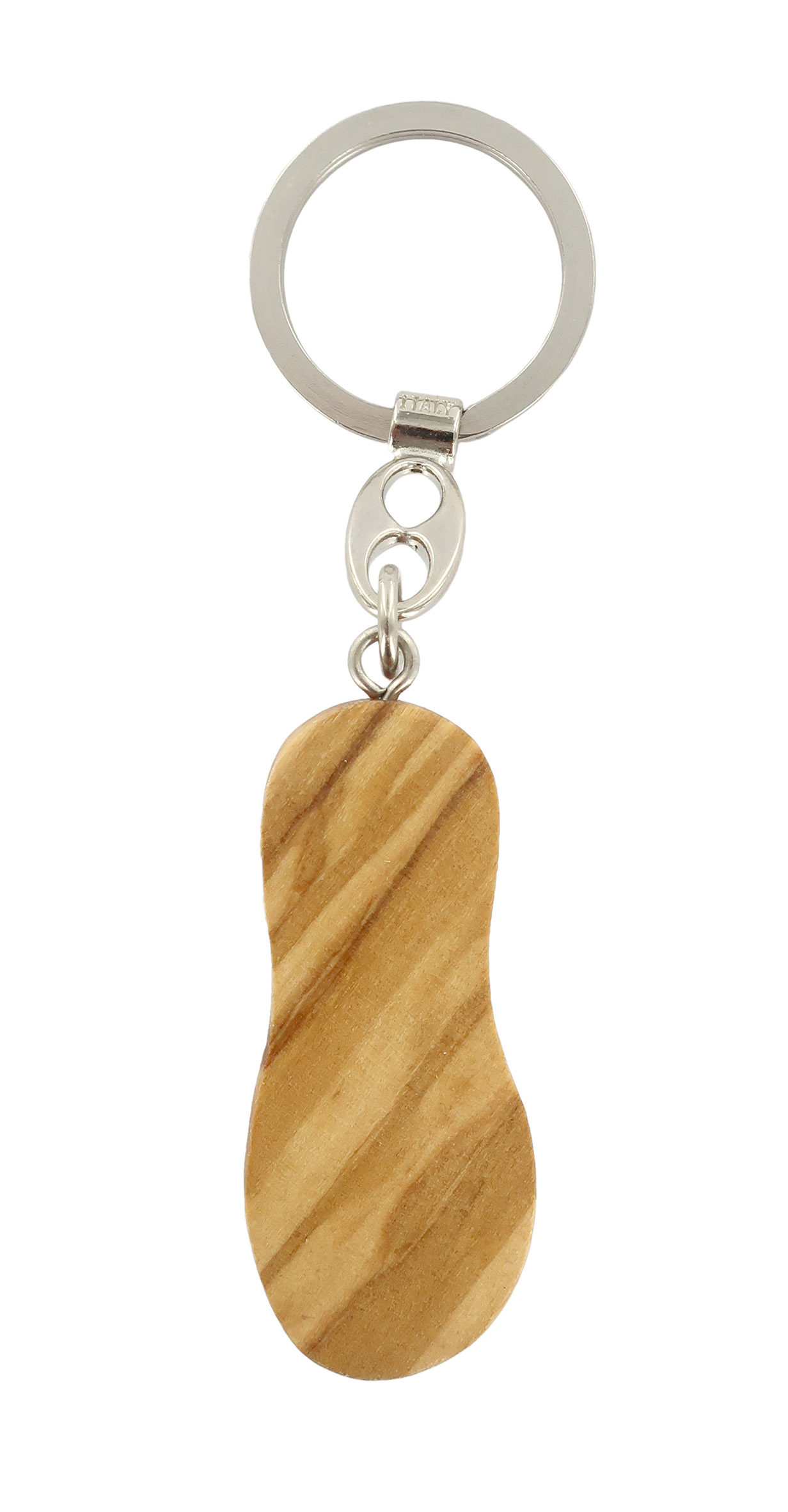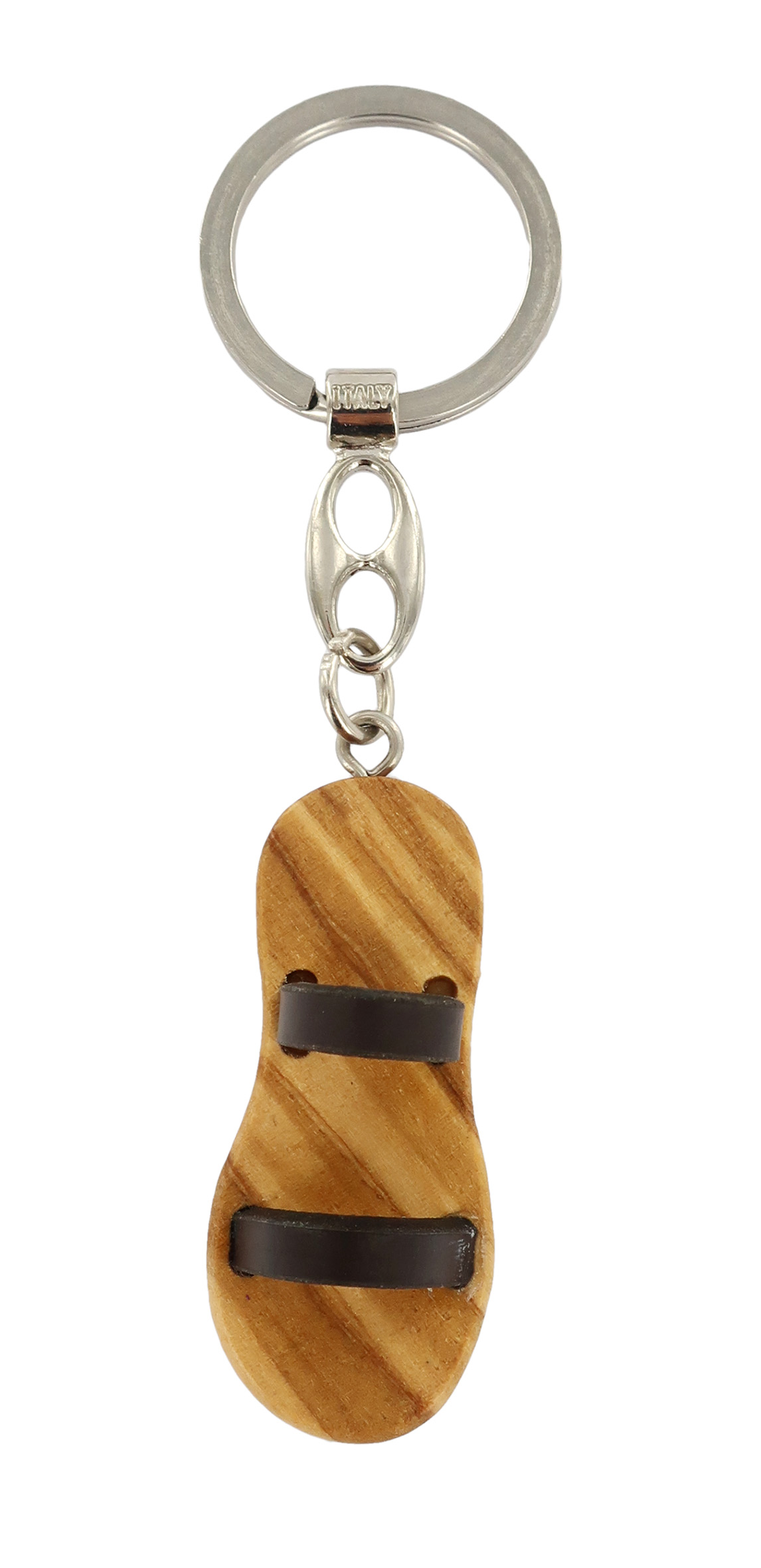Portachiavi Sandalo Francescano realizzato in legno d'ulivo con fascetta in pelle, munito di gancio ad anello.