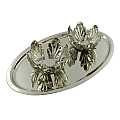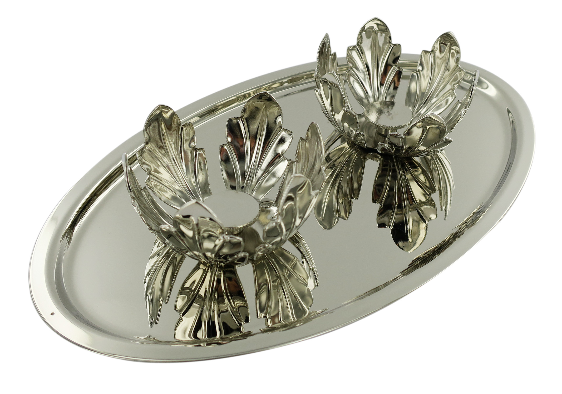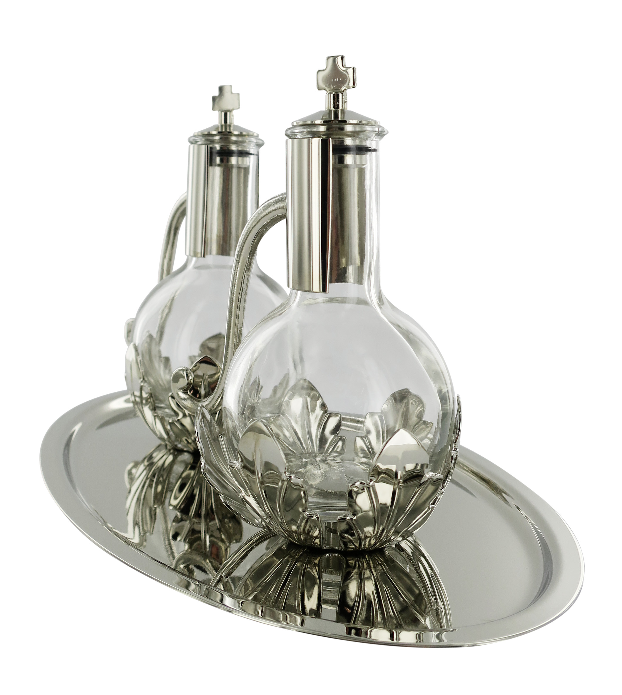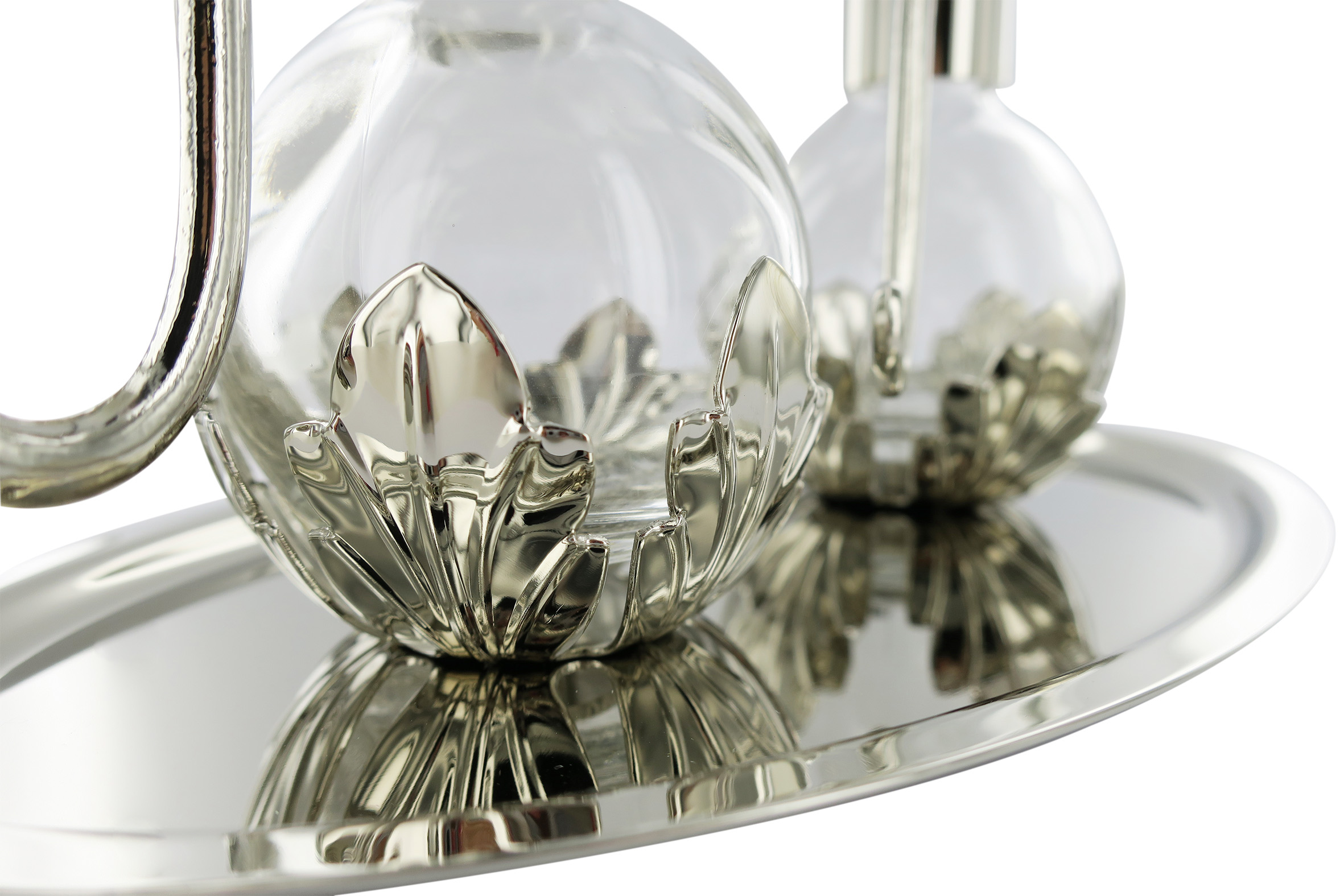 Ampolline in vetro soffiato capacità 100cc su vassoio in ottone "Abbraccio" nichel .