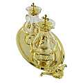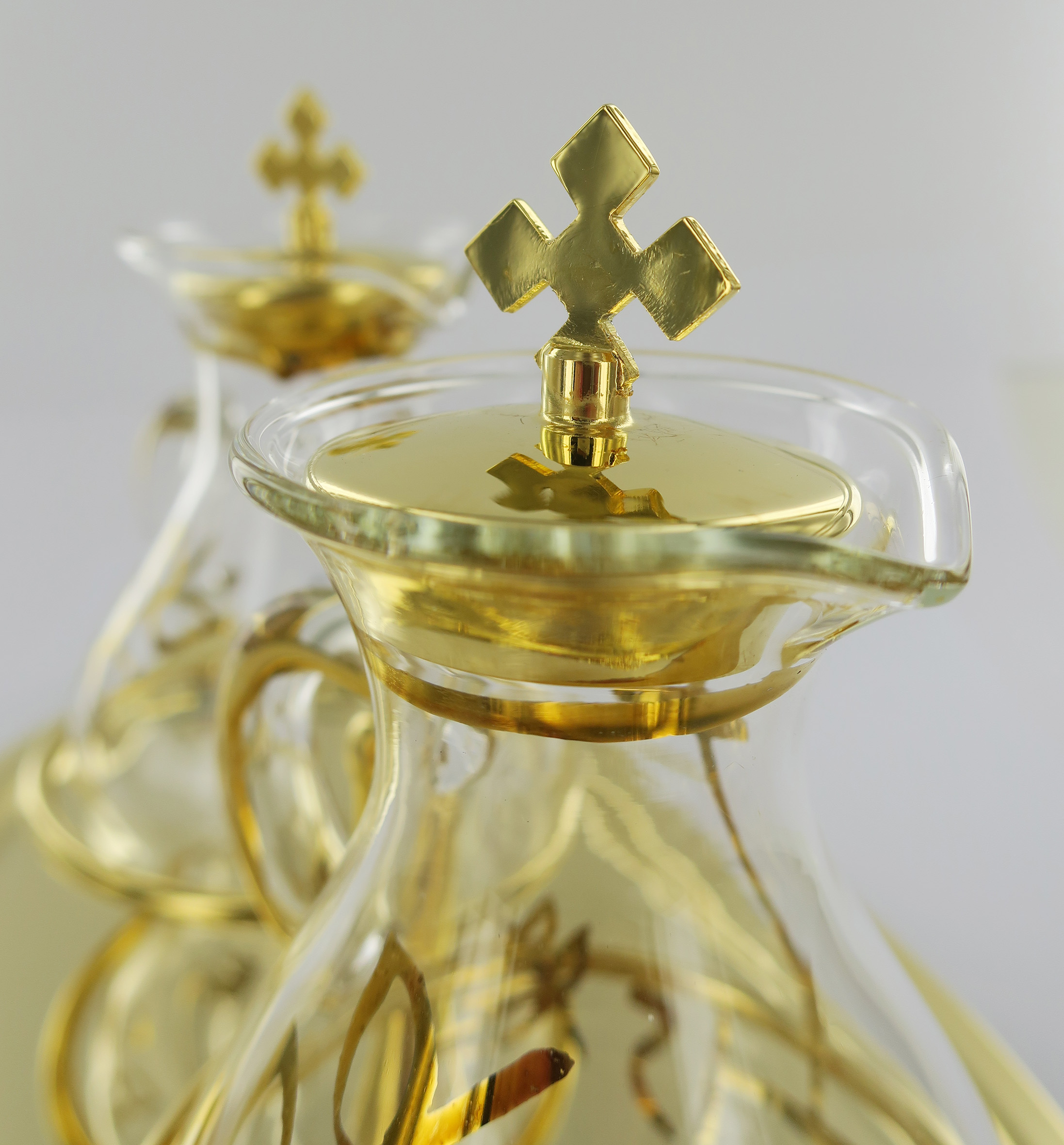 Coppia di ampolline in vetro soffiato con decori dorati e vassoio in ottone dorato con manici che fungono da piedini di appoggio.