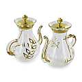 Coppia di ampolline in vetro soffiato con beccuccio e decoro dorato con capienza di 100cc. Il vassoio in vetro è decorato in oro e i coperchi sono in ottone dorato. Prodotto interamente in Italia.