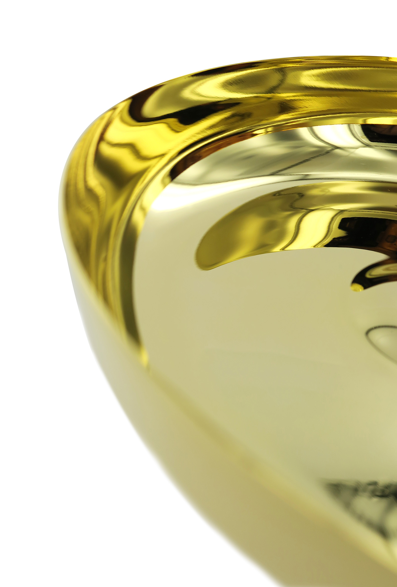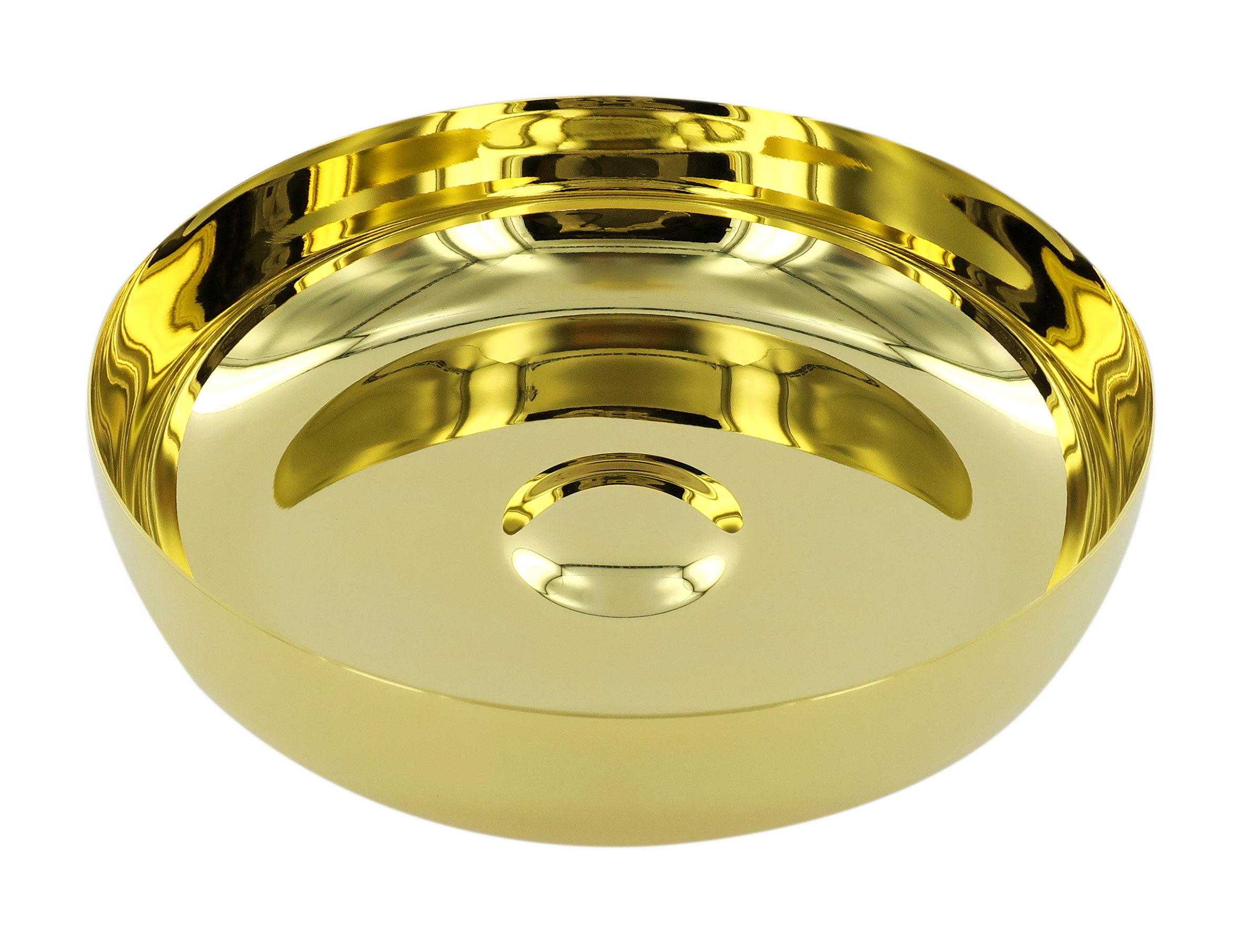 Patena offertoriale in metallo dorato con piede, diametro 16 cm. Realizzato in Italia.