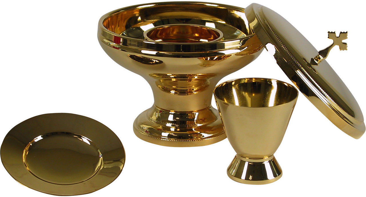 Completo due specie dorato. Diametro cm 15 x 15 di altezza, croce compresa. Asportando gli accessori interni (anella portaostie, calice e patena) puo' essere utilizzata come una capiente pisside. L'anella contiene circa 150 particole, la pisside circa 300.