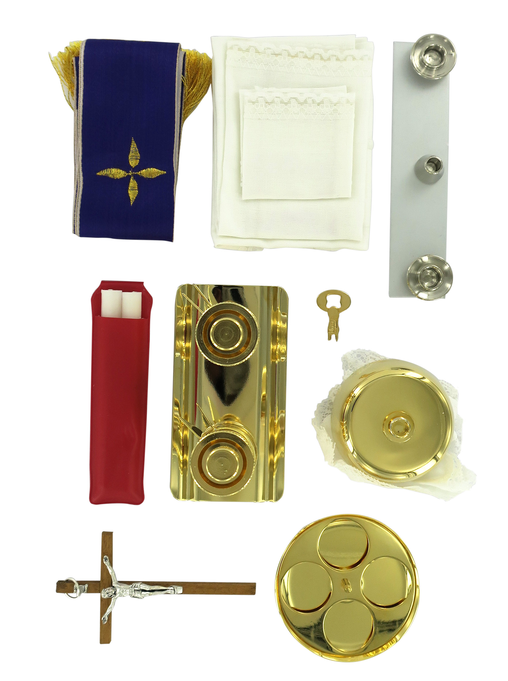 Valigia per celebrazioni: Servizio completo da altare con 15 oggetti. Astuccio di lusso con l'interno scamosciato, da viaggio con dimensioni ridottissime (14 x 20 x 5 cm). Rifinito con cura e con oggetti particolari (ampolle ermetiche, calicetto componibile, piccola patena, altarino, scatola per particole, tovaglie ricamate, stoletta...). Realizzato in Italia.