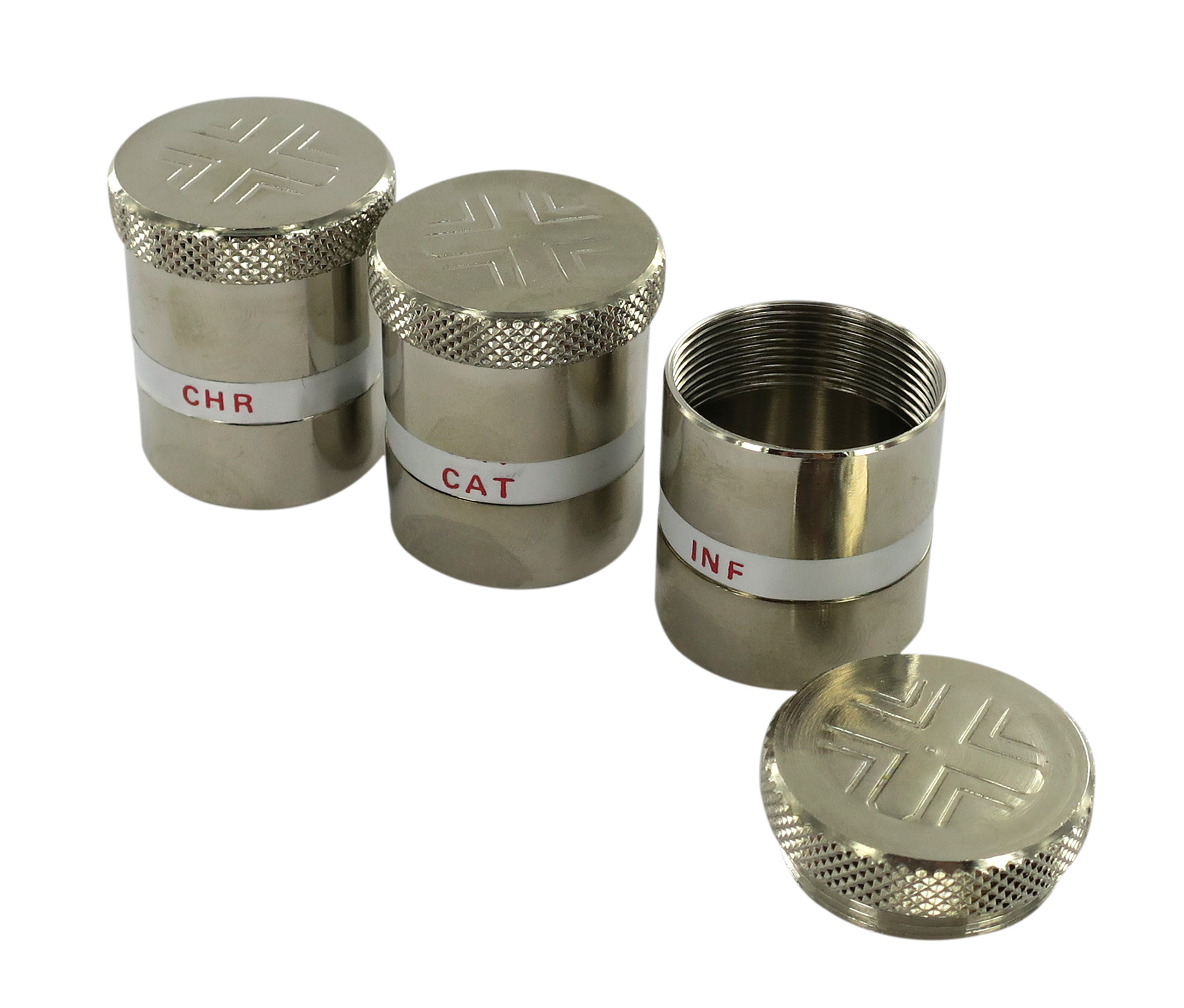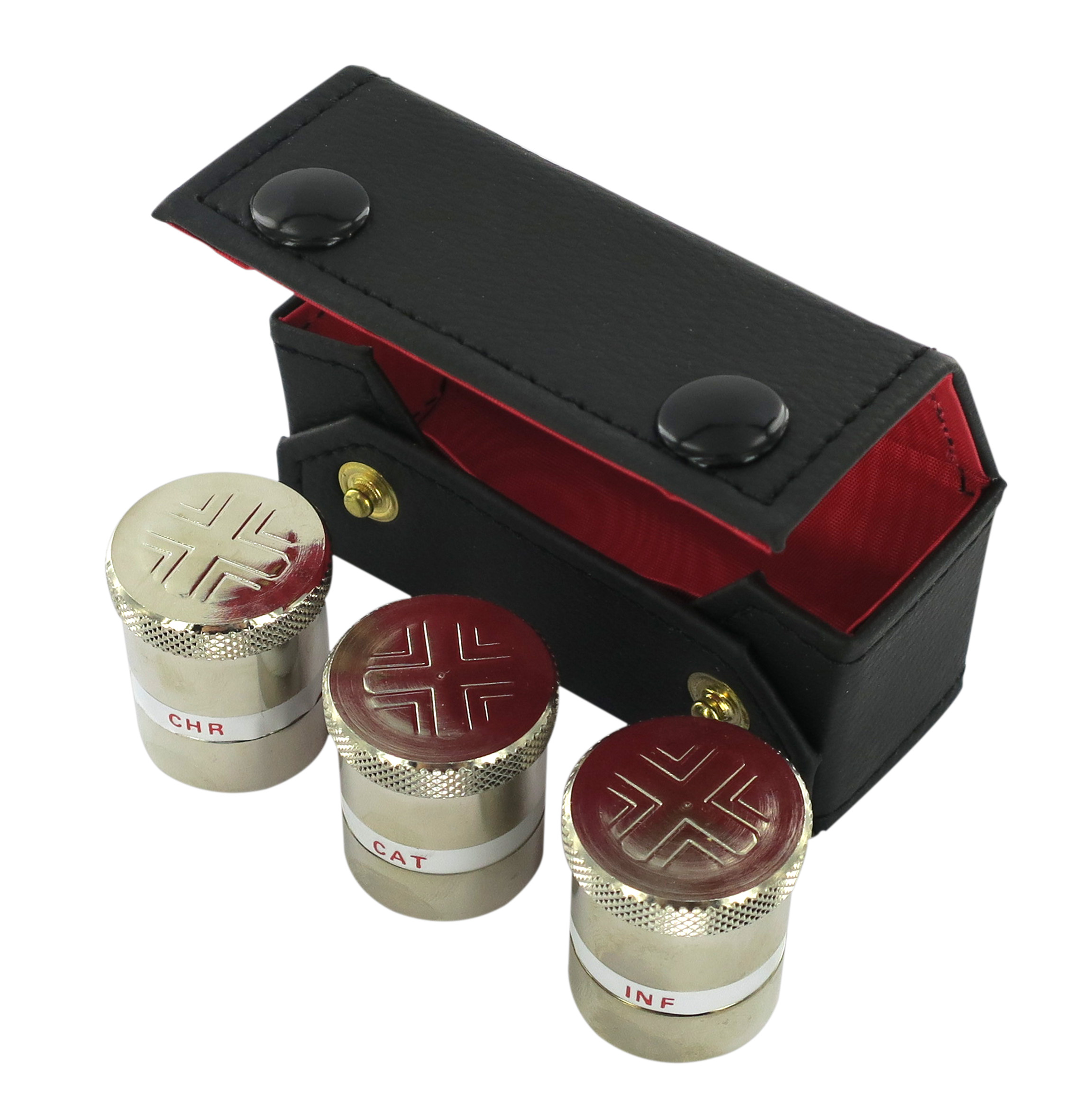Astuccio (kit celebrazione messa) con tre vasetti affiancati in metallo.