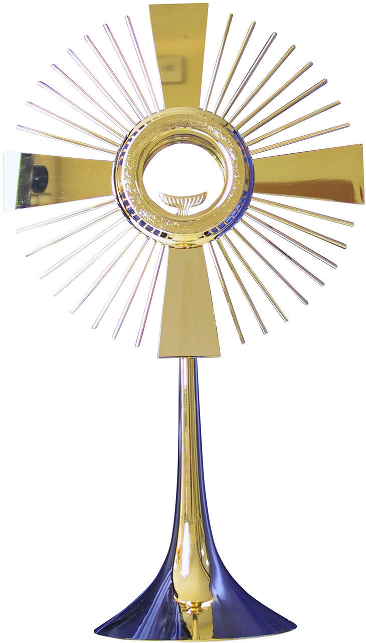 Portaostensorio costruito in robusto legno di pioppo da 1 cm e rivestito in vera pelle, rifiniture molto accurate. L'interno è in morbida gomma piuma ricoperta di raso blu. Bisogna controllare bene le misure, può accogliere un'ostensorio con altezza massima di cm. 58, raggiera massimo cm. 34, piede massimo Ø cm. 19.