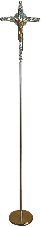 Croce da processione, costruita interamente in bronzo, con manico in ottone, fornita bicolore, con o senza supporto. Misura: 200 x 35 cm, la base è di diametro 25 x 3 cm, la sola croce 45 x 35 cm.