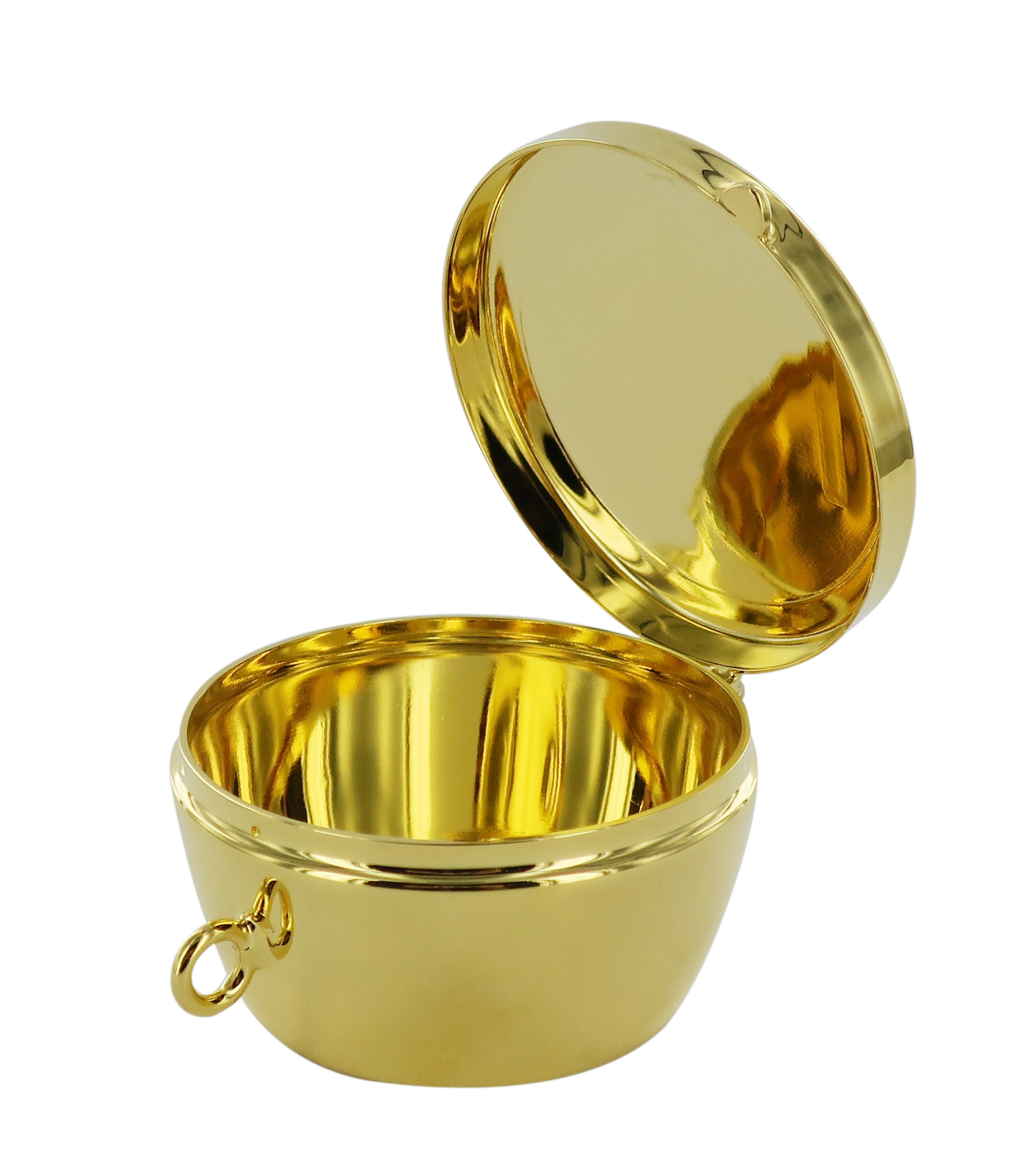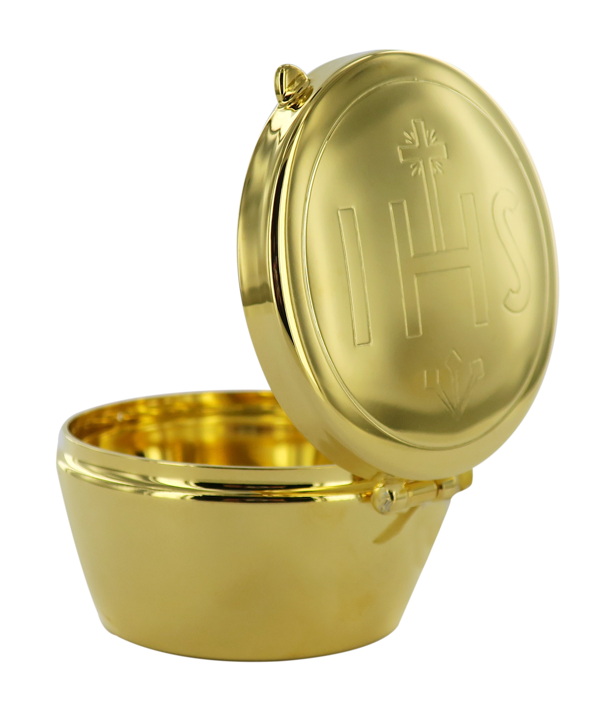 Teca alta con incisione del monogramma IHS. Misure: diametro 5,4 cm, altezza 3,2 cm. Realizzato in Italia.