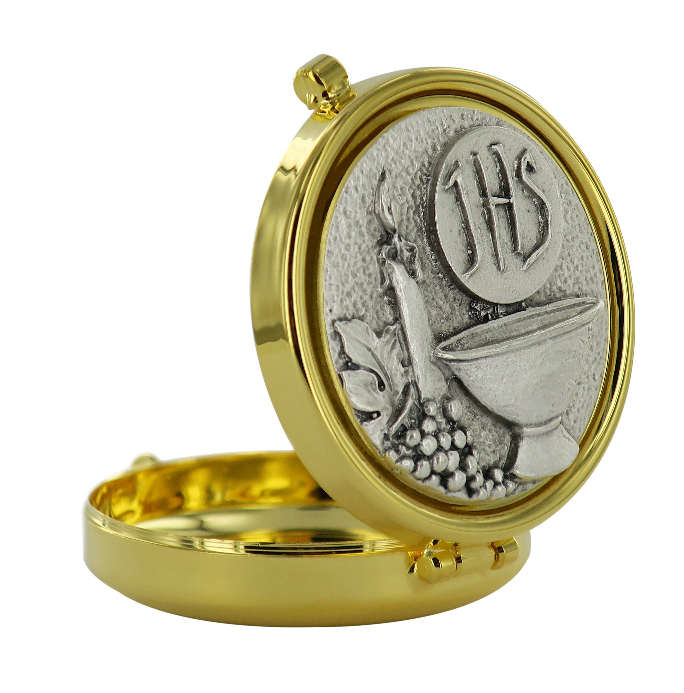 Teca eucaristica ostie con placca in peltro Calice e cero - Ø 5,4 cm