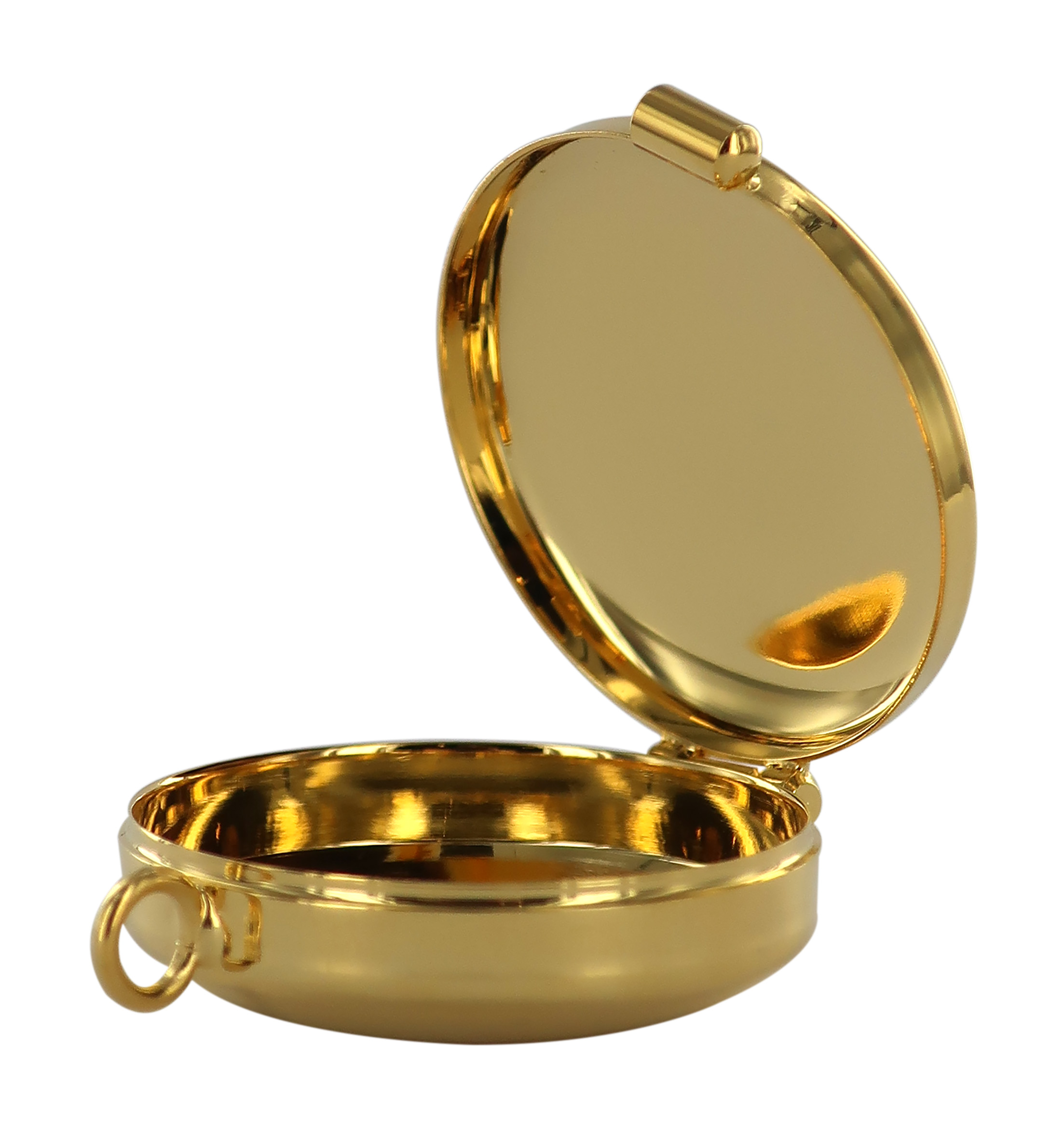 Teca eucaristica in metallo dorato con incisione IHS sul coperchio. E' completa di anello per portarla al collo.