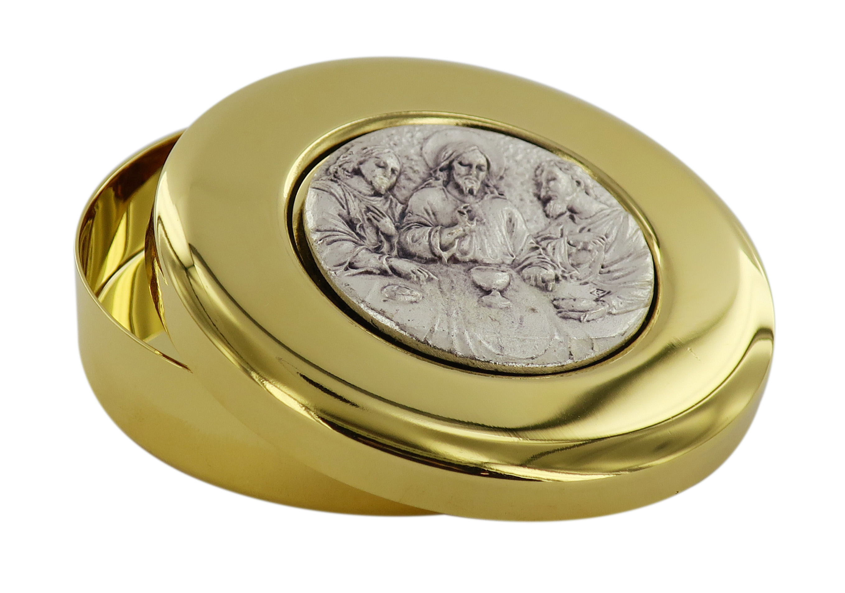 Teca eucaristica ostie in ottone dorato con placca ultima cena - Ø 7,5 cm