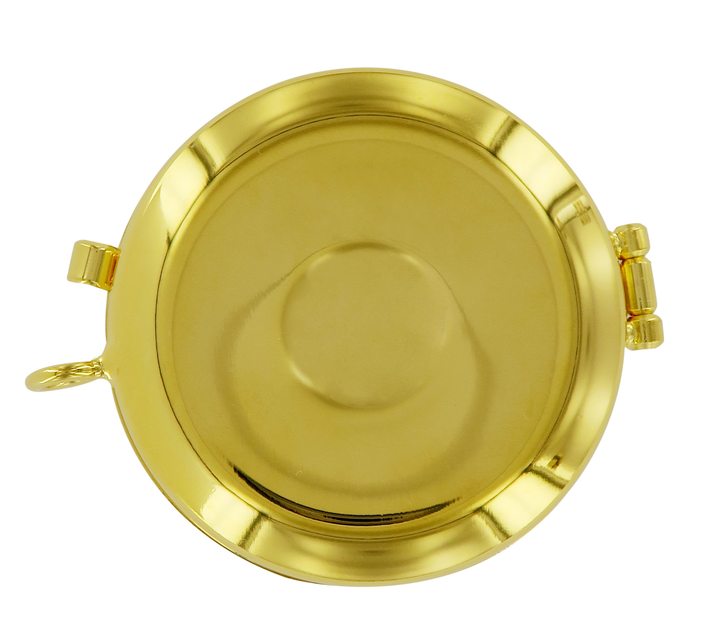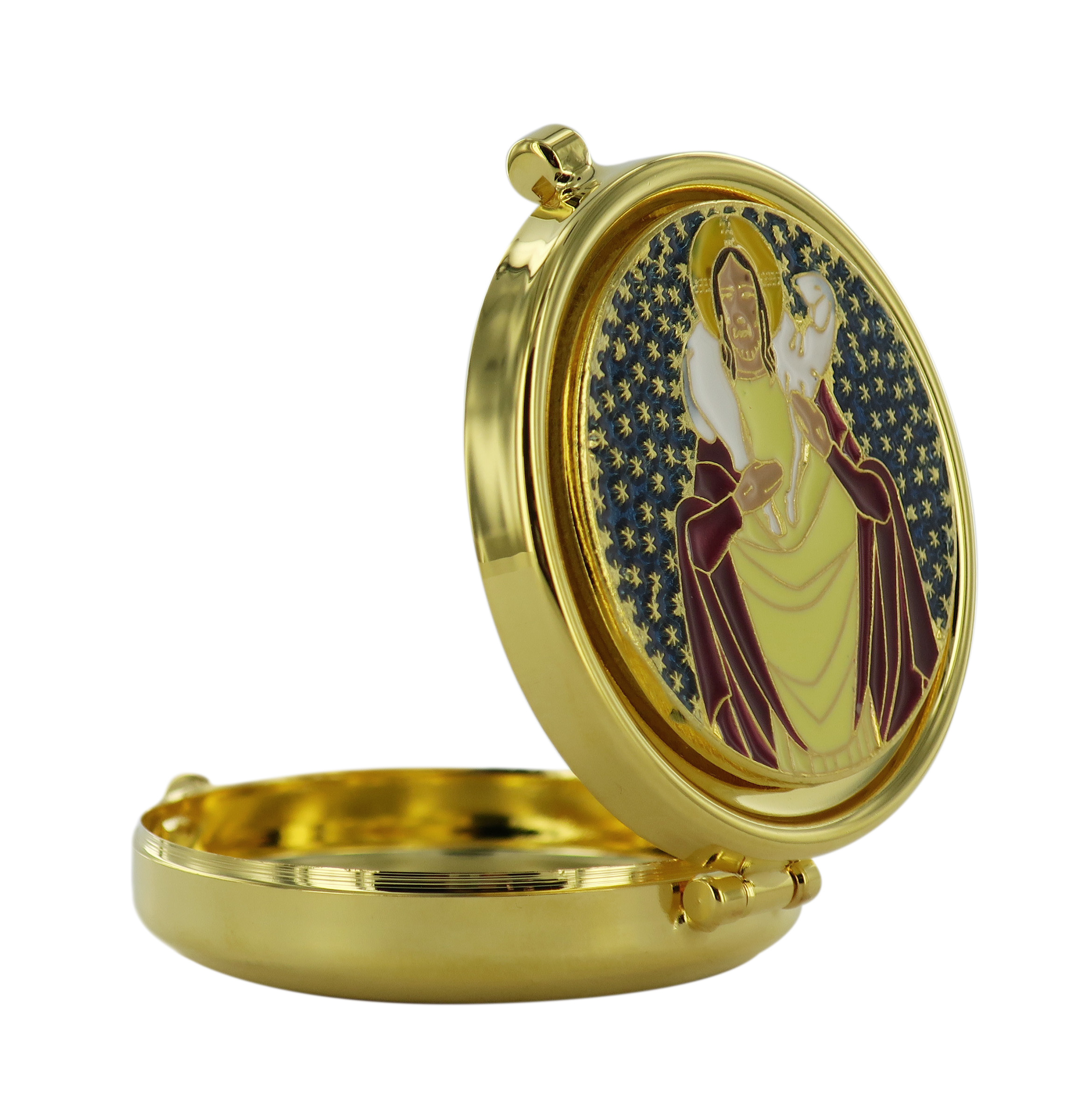 Teca eucaristica in metallo dorato, all'interno come all'esterno, con decorazione del Buon Pastore , colorato e smaltato sul coperchio. Completa di anello per portarla al collo.