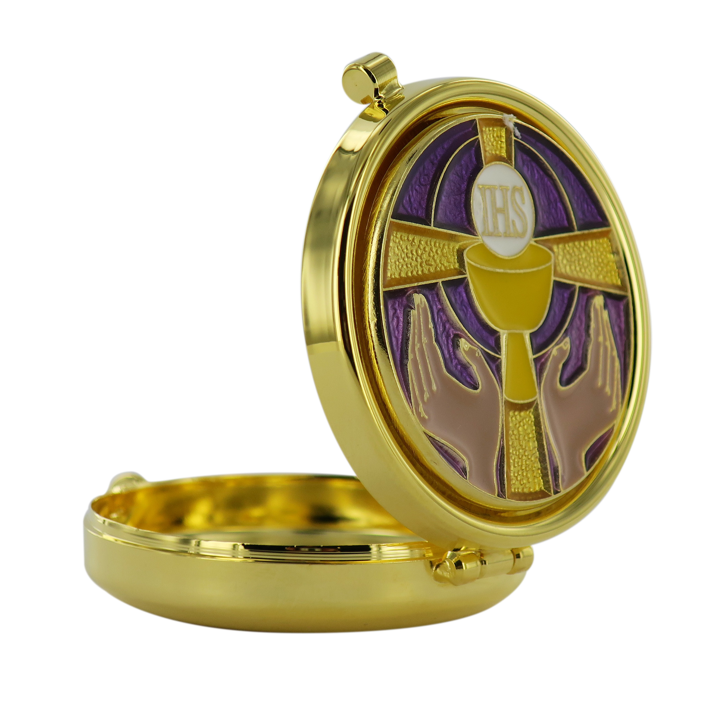 Teca eucaristica in metallo dorato, all'interno come all'esterno, con decorazioni di simboli eucaristici, mani in offerta e la croce, dipinti a smalto sul coperchio.