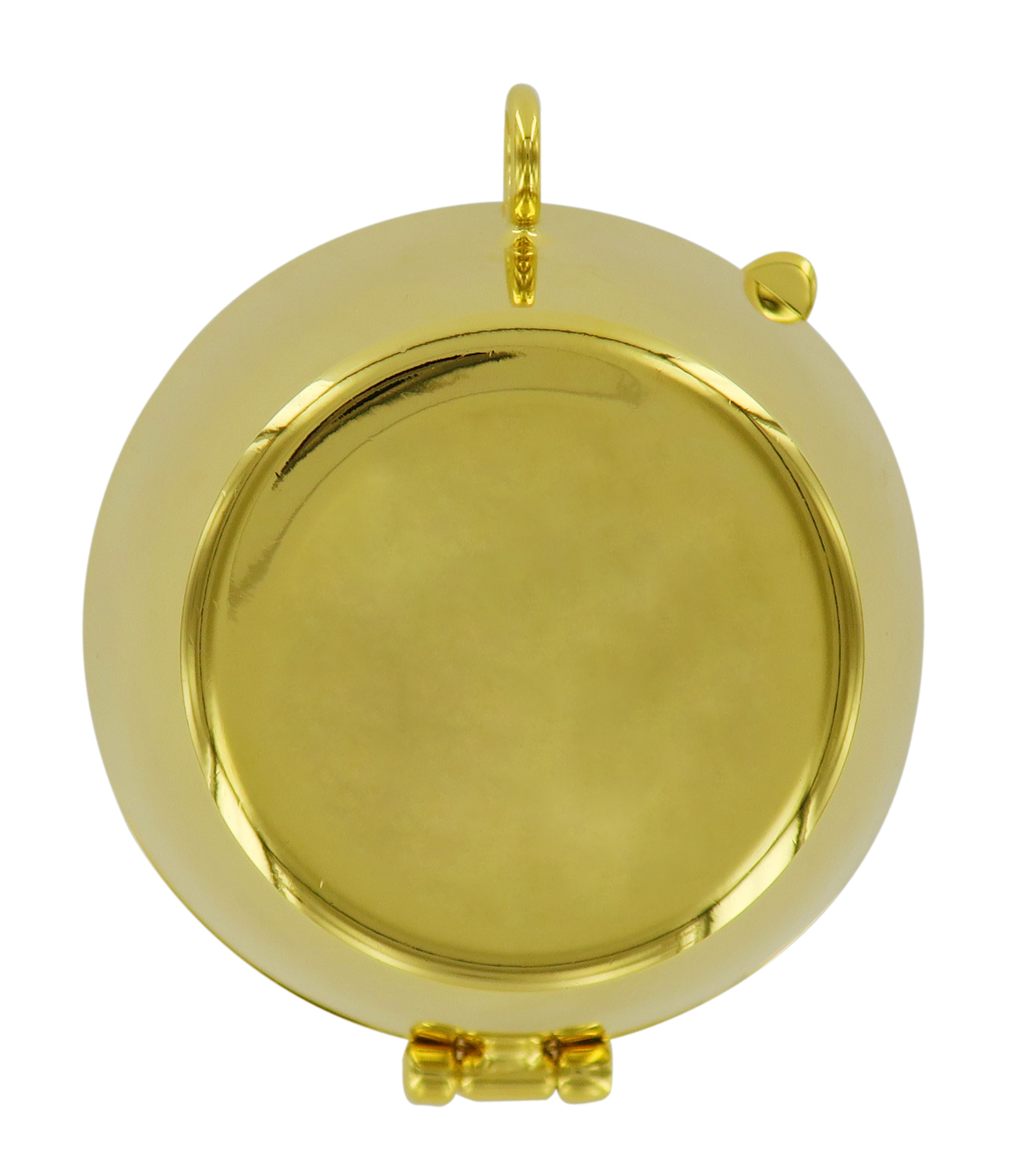 Teca alta in metallo dorato con placca. Contiene circa 25 particole. Il soggetto della placca/medaglia è variabile e potrebbe essere diverso da quello mostrato in foto. La foto qui pubblicata è puramente indicativa e il prodotto ricevuto potrebbe avere un disegno differente.