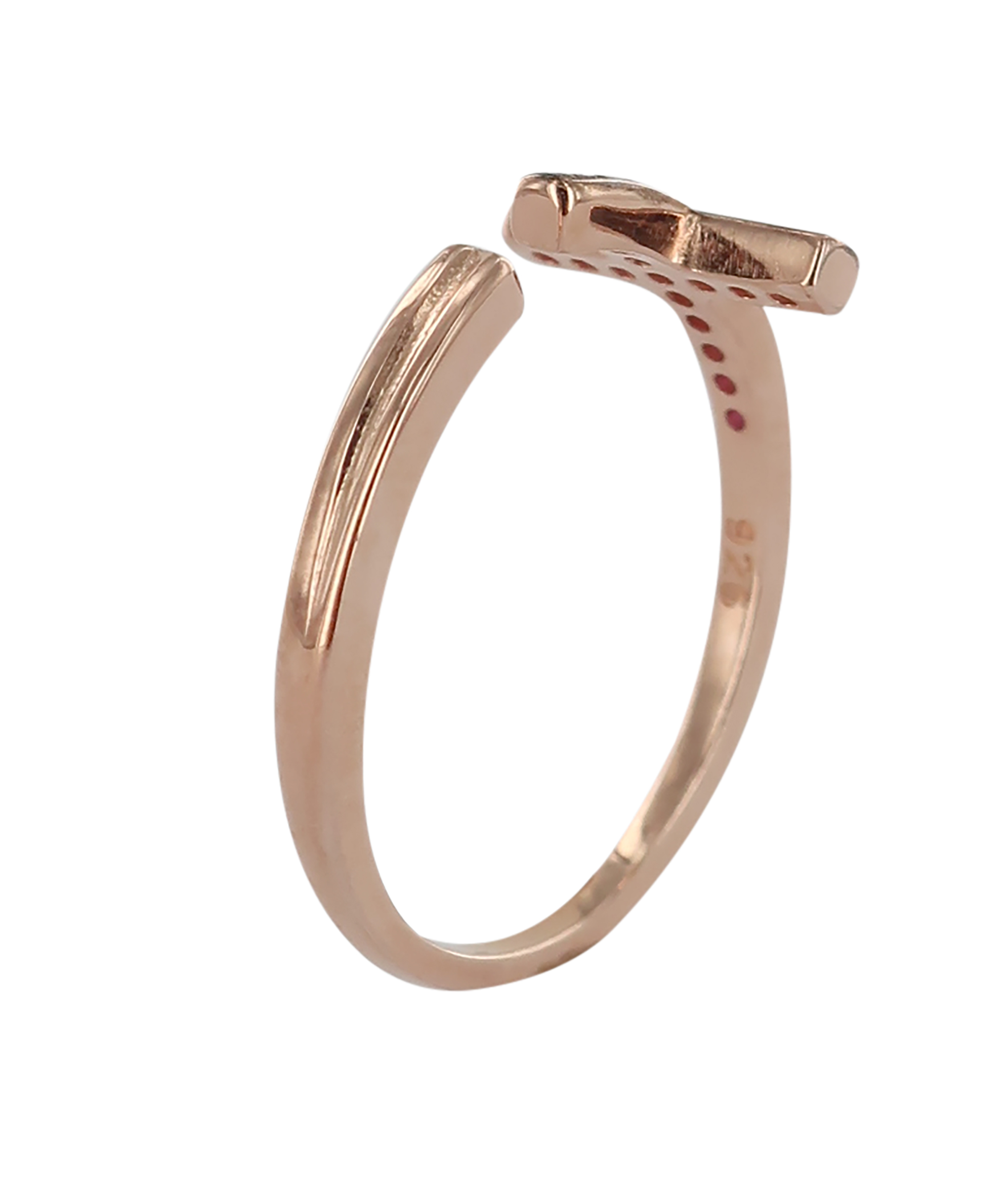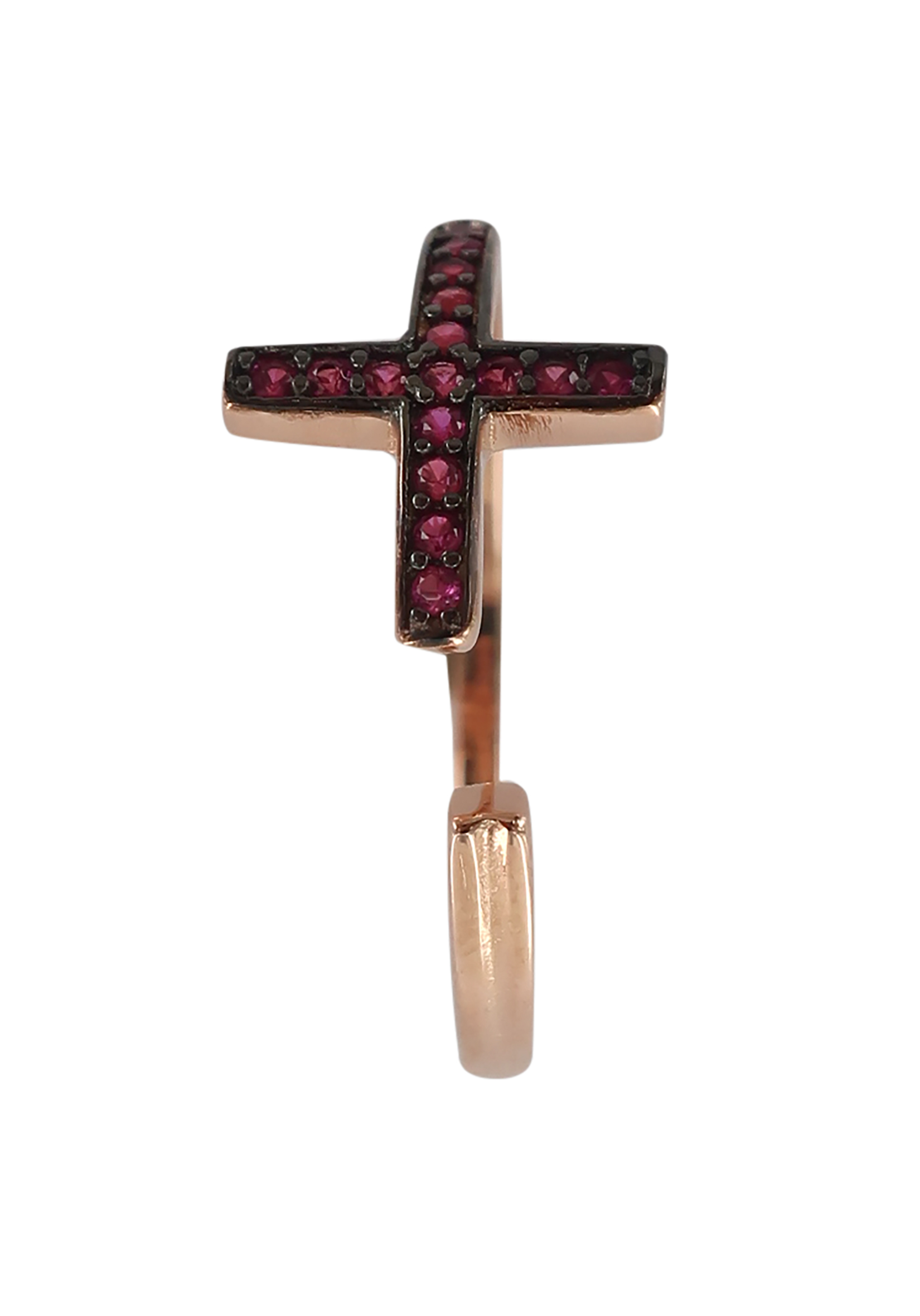 Anello in argento bagnato in oro rosa con croce impreziosita da strass di colore rosso.