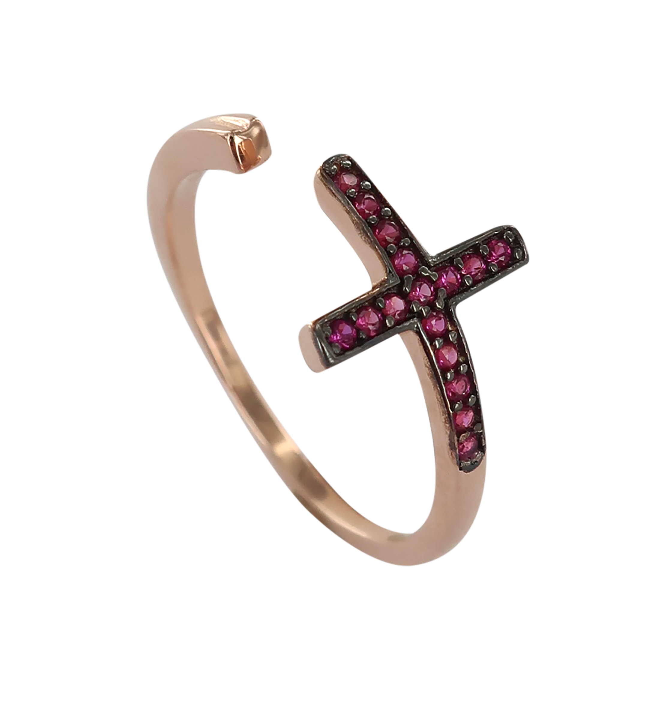 Anello con croce strass rossi in argento 925 con bagno oro rosa