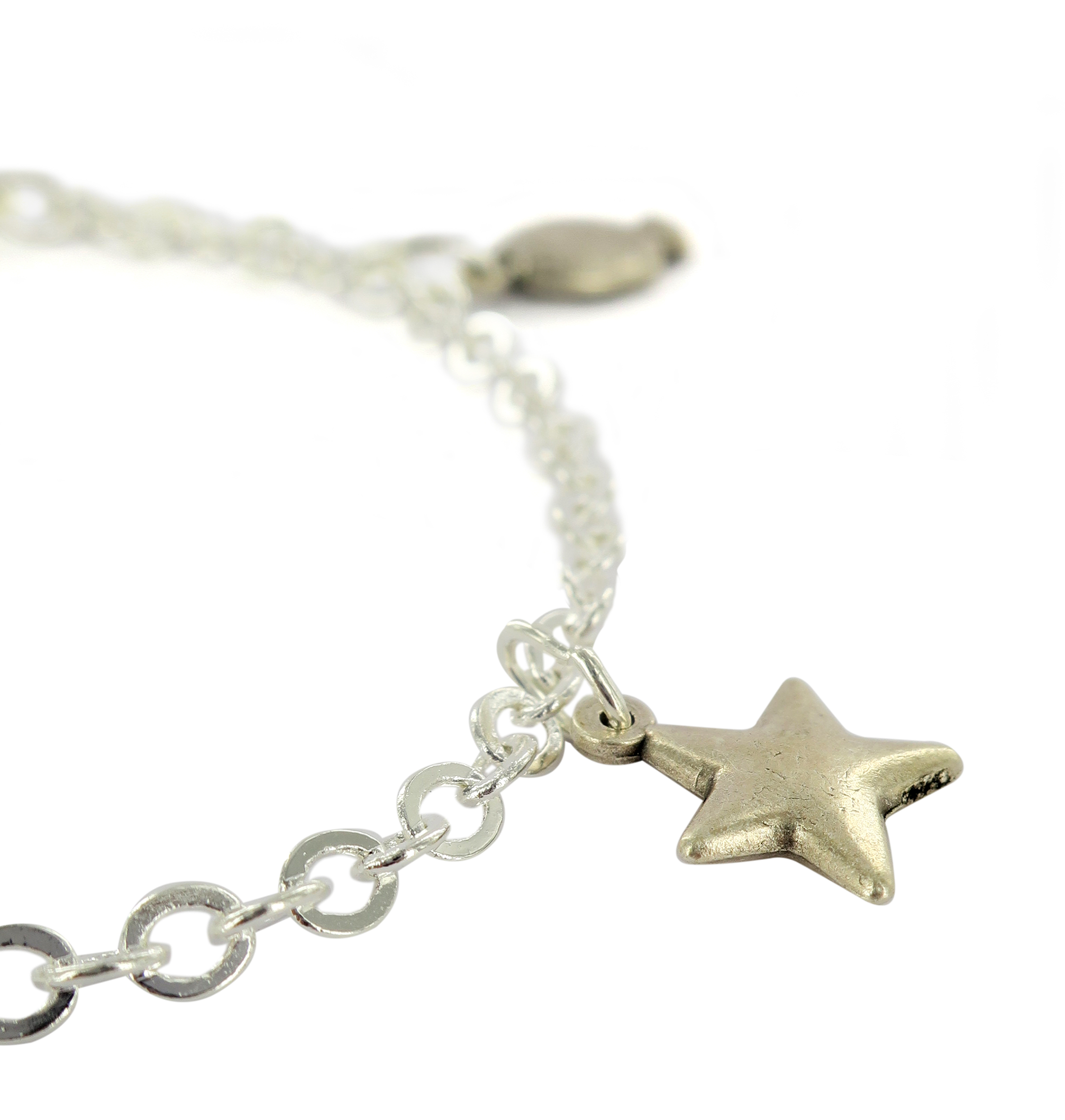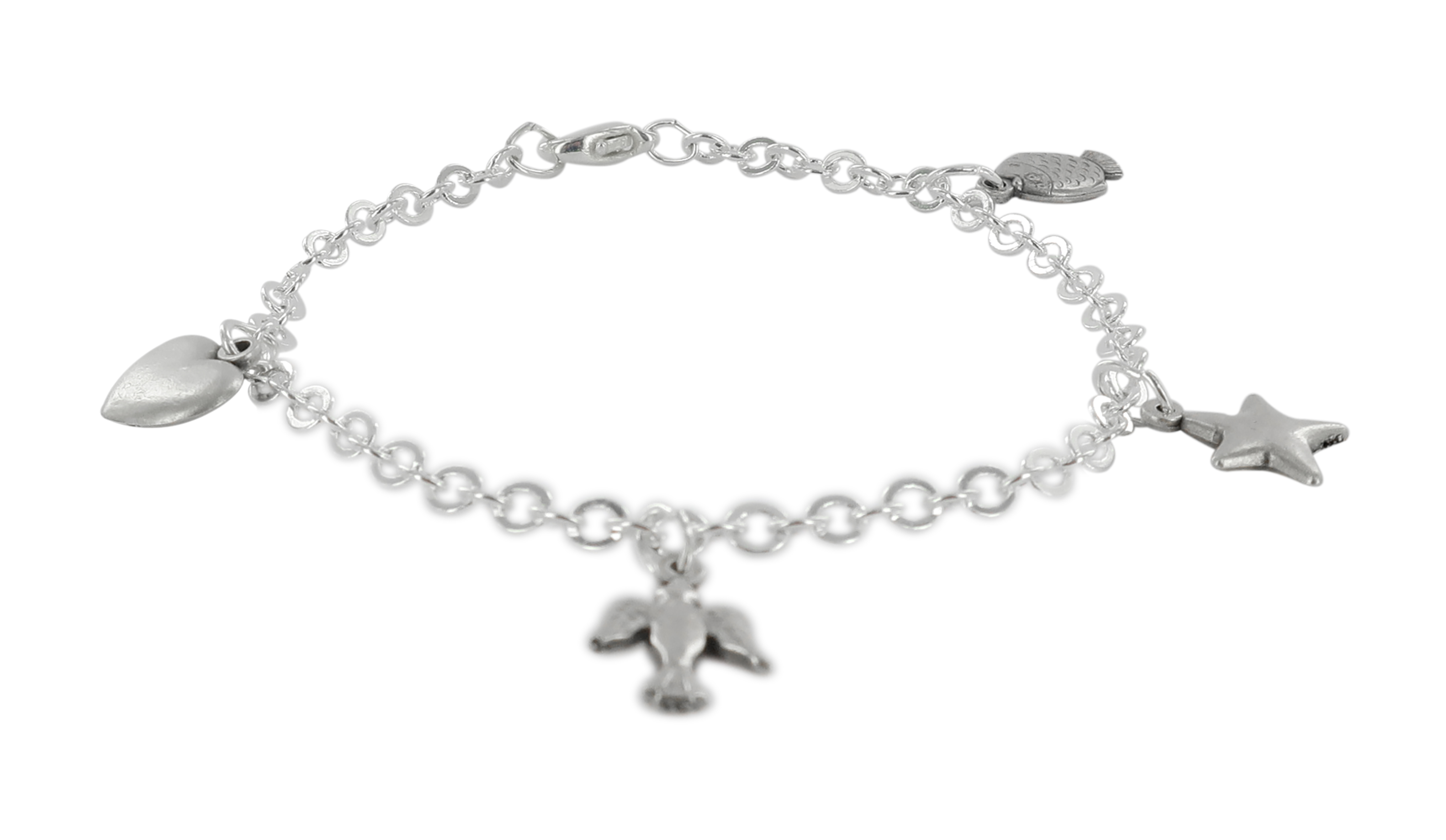 Braccialetto realizzato con catena in metallo argentato a maglia larga nella quale sono inseriti dei ciondoli raffiguranti: la colomba dello Spirito Santo,il pesce simbolo dei primi cristiani,il cuore simbolo dell'amore e la stella.
