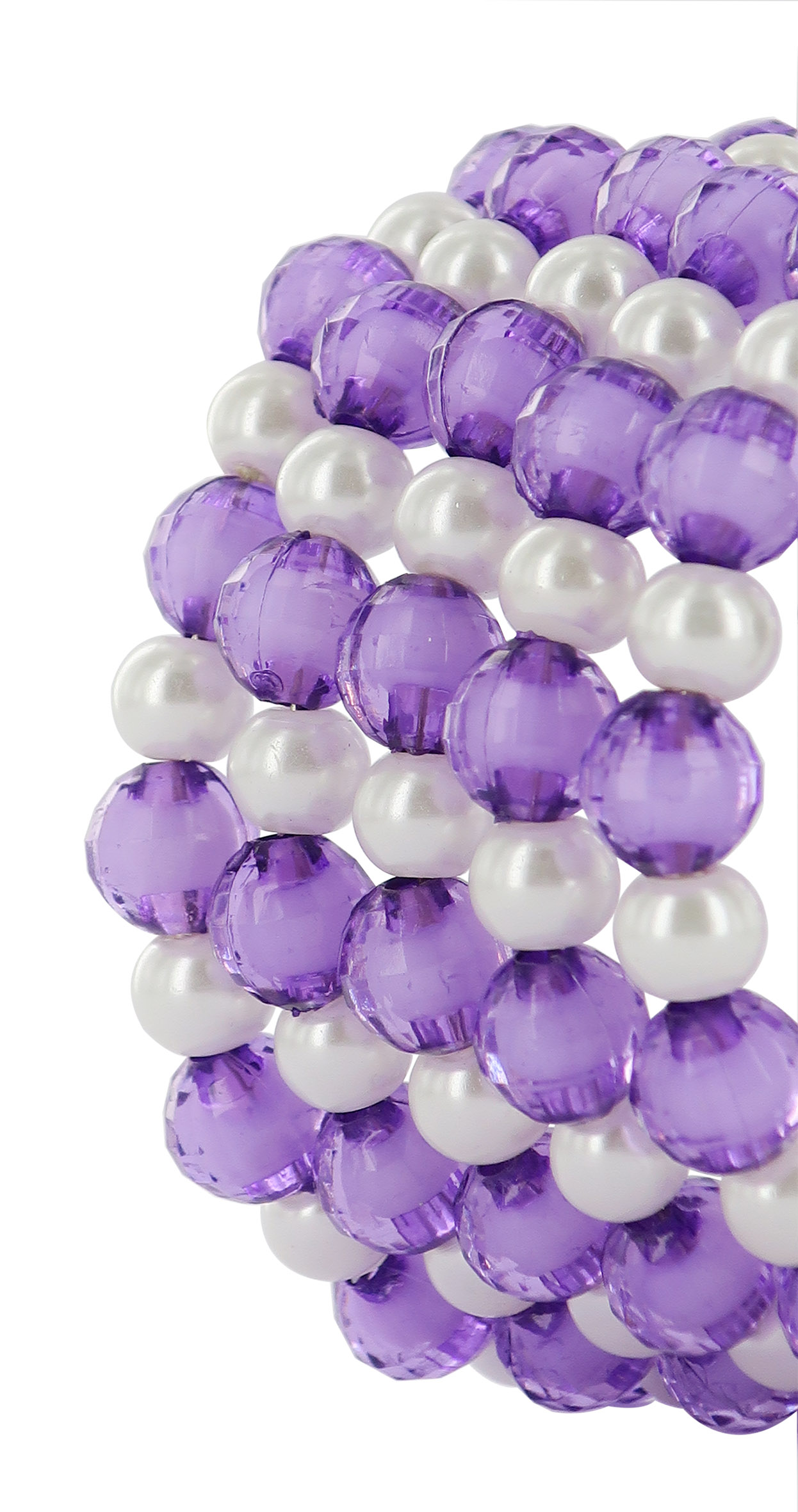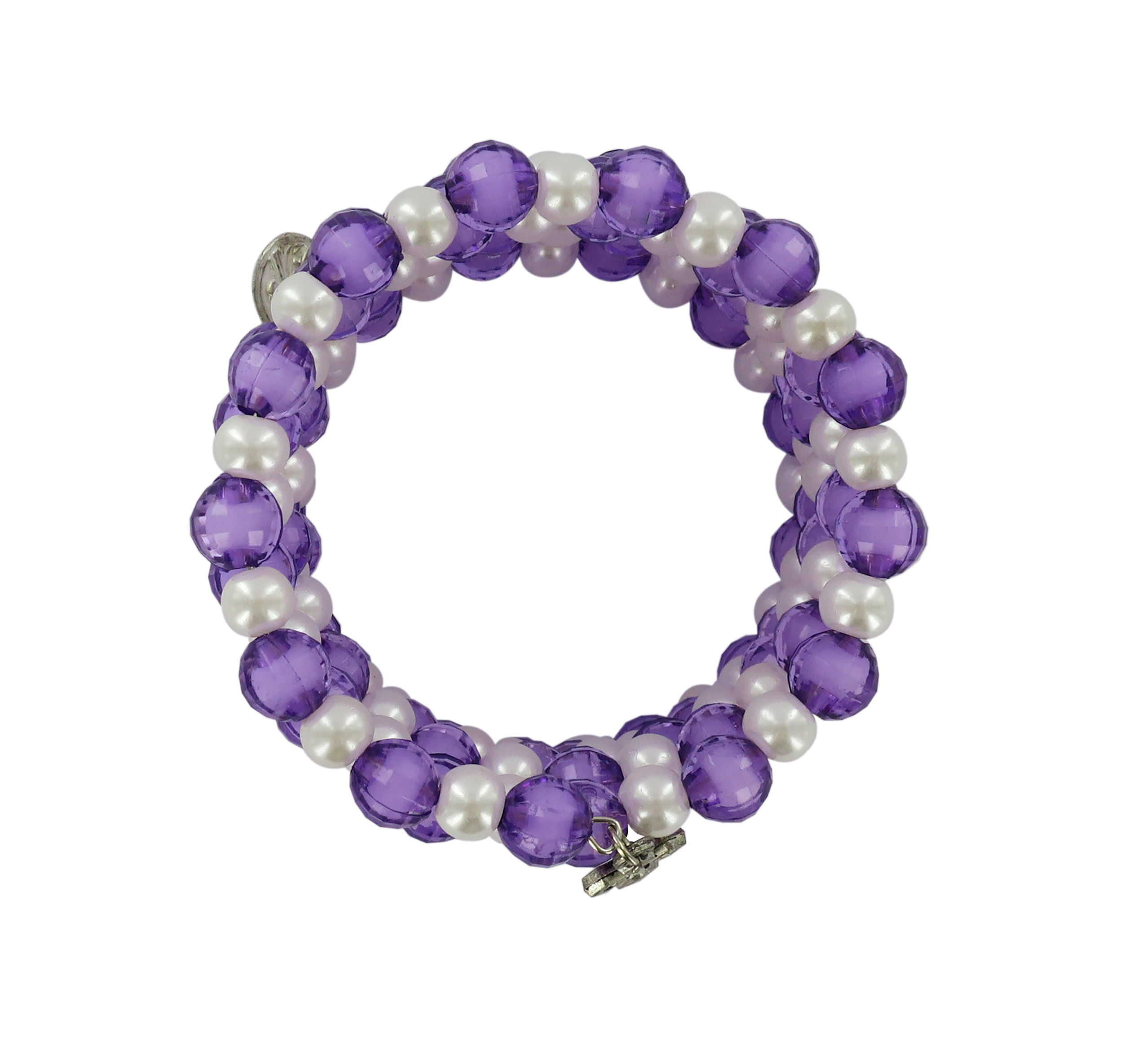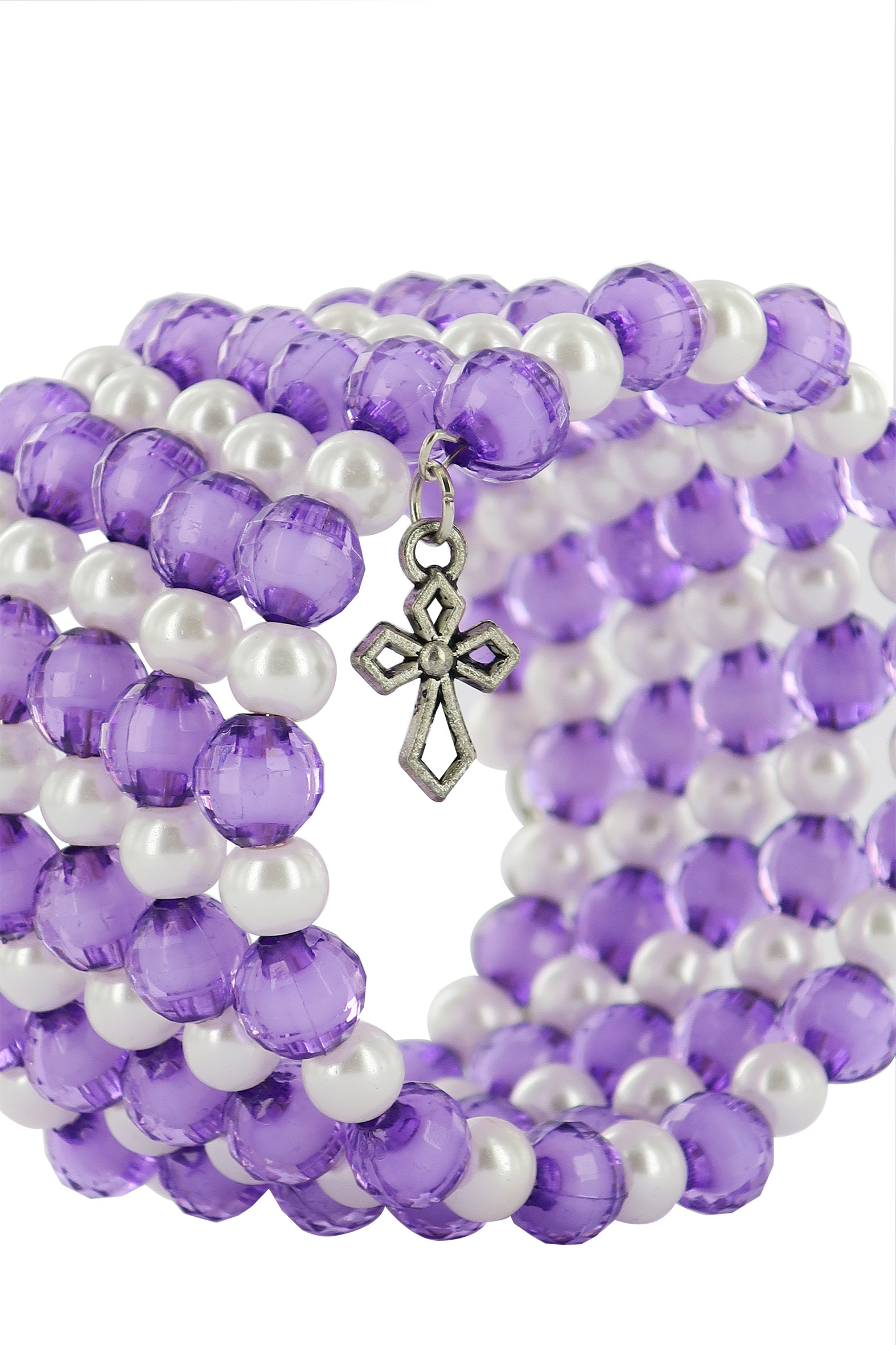 Braccialetto a fascia bianco e viola, con pendente a forma di croce. Veste il polso in modo comodo. Misura adattabile al polso. Perline bianche color perla e viola, leggermente trasparente, con superficie sfaccettata. Confezione risparmio multipack.