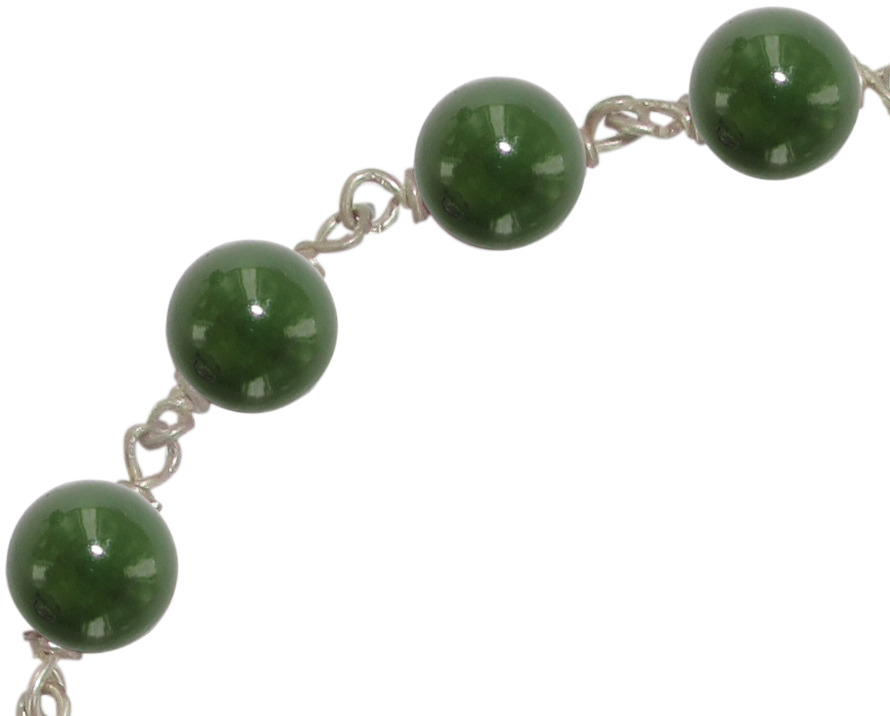 Il bracciale decina è incatenato a girello con filo in argento 925 e con 11 grani in giada. Una medaglietta in argento che misura cm 1 e rappresenta la Vergine Miracolosa chiude il bracciale.