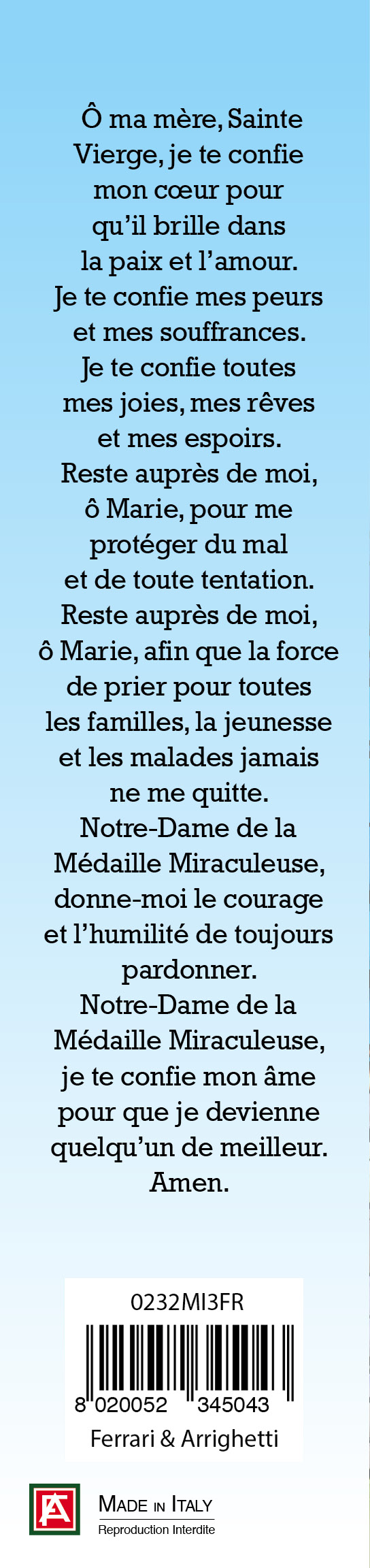 Il bracciale è confezionato in un cartoncino con l'immagine della Madonna Miracolosa, sul retro vi è una preghiera dedicata a lei scritta in francese (il tutto infilato in una busta trasparente).