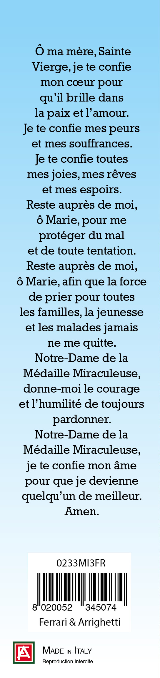 Il bracciale è confezionato in un cartoncino con l'immagine della Madonna Miracolosa, sul retro vi è una preghiera dedicata a lei scritta in francese (il tutto infilato in una busta trasparente).