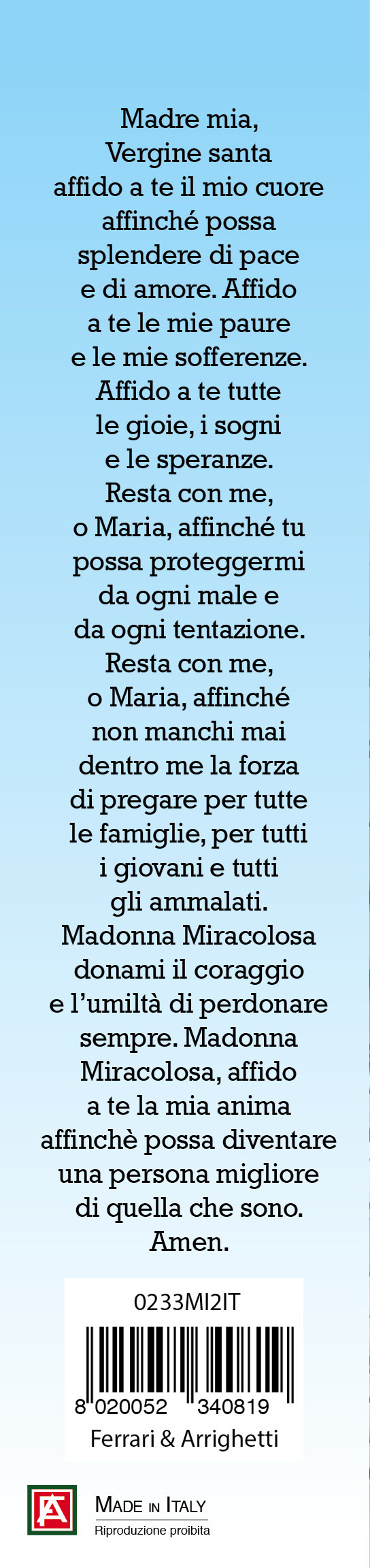 E' confezionato in un cartoncino con l'immagine della Madonna Miracolosa, sul retro vi è una preghiera dedicata a lei il tutto infilato in una busta trasparente.