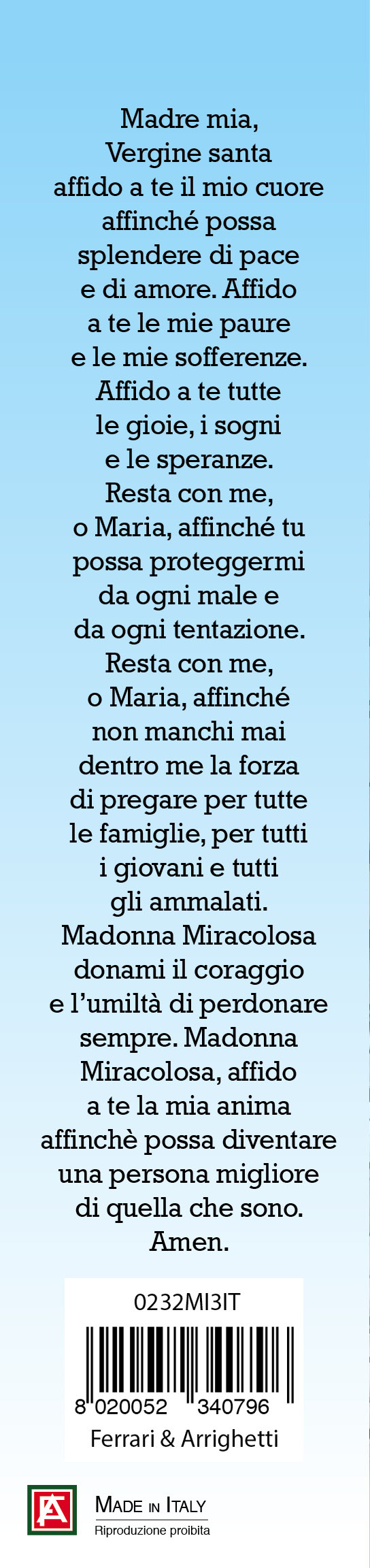 E' confezionato in un cartoncino con l'immagine della Madonna Miracolosa, sul retro vi è una preghiera dedicata a lei il tutto infilato in una busta trasparente.