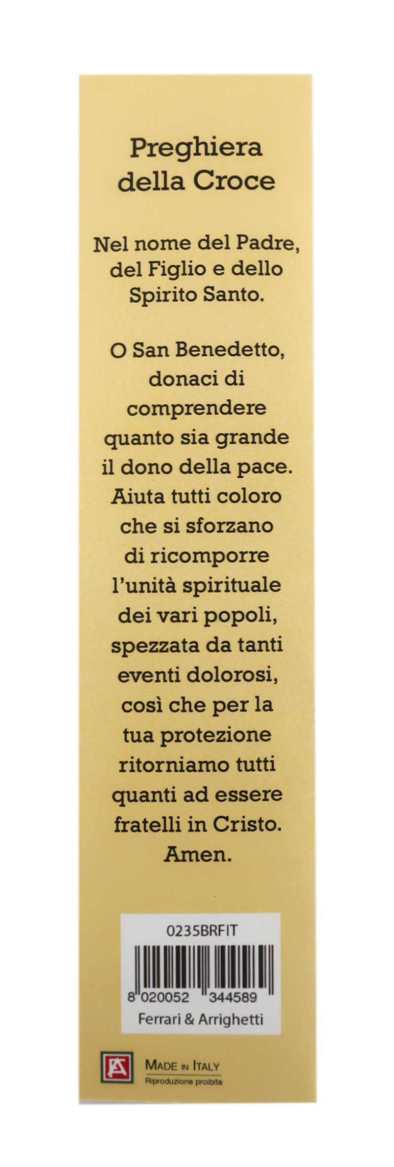 E' confezionato in un cartoncino con l'immagine di San Benedetto, sul retro vi è una preghiera dedicata a lui, il tutto infilato in una busta trasparente.