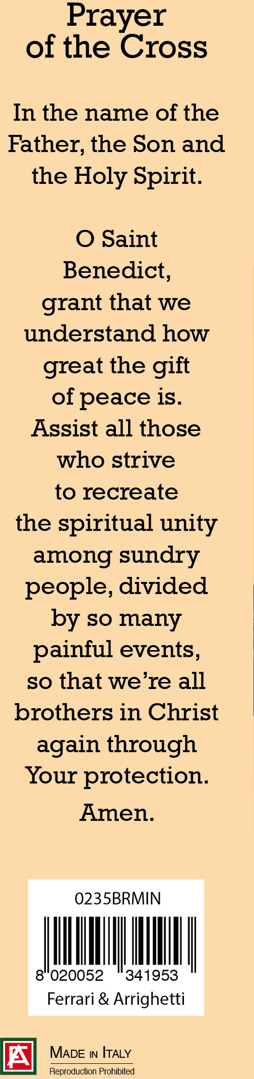 Il bracciale si presenta con grani in legno ebano con una medaglia tonda in argento 925. E' confezionato in un cartoncino con l'immagine di San Benedetto, sul retro vi è una preghiera dedicata a lui, il tutto infilato in una busta trasparente.