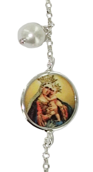 Questo delizioso braccialetto in argento 925% si presenta con al centro una delicata immagine della Madonna con il bambino in braccio stampata su porcellana del diametro di cm 1,5 e incastonato in un profilo di argento lucido.