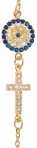 Braccialetto con croce e medaglia con strass bianchi e blu in argento 925 con bagno in oro giallo