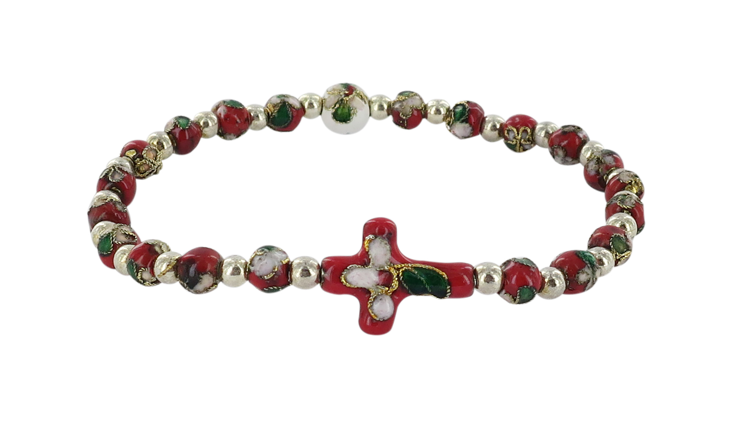 Braccialetto cloisonnè con 21 grani e croce di altezza 2 cm con base di colore rosso con robusto elastico.