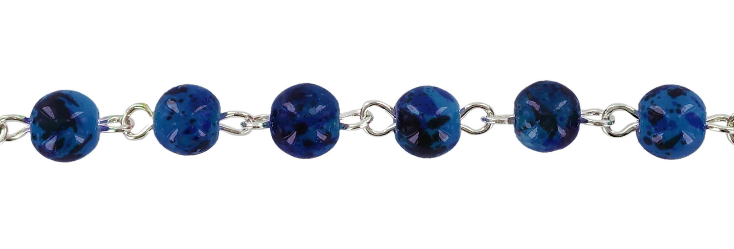Braccialetto con palline in vetro maculato di diametro 6 mm di colore blu e croce di altezza 2 cm.