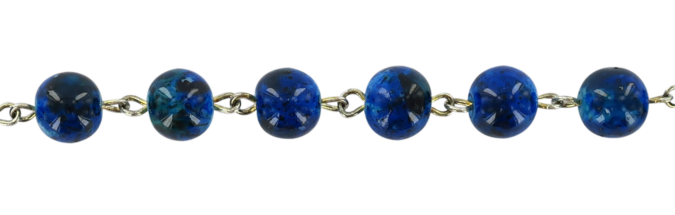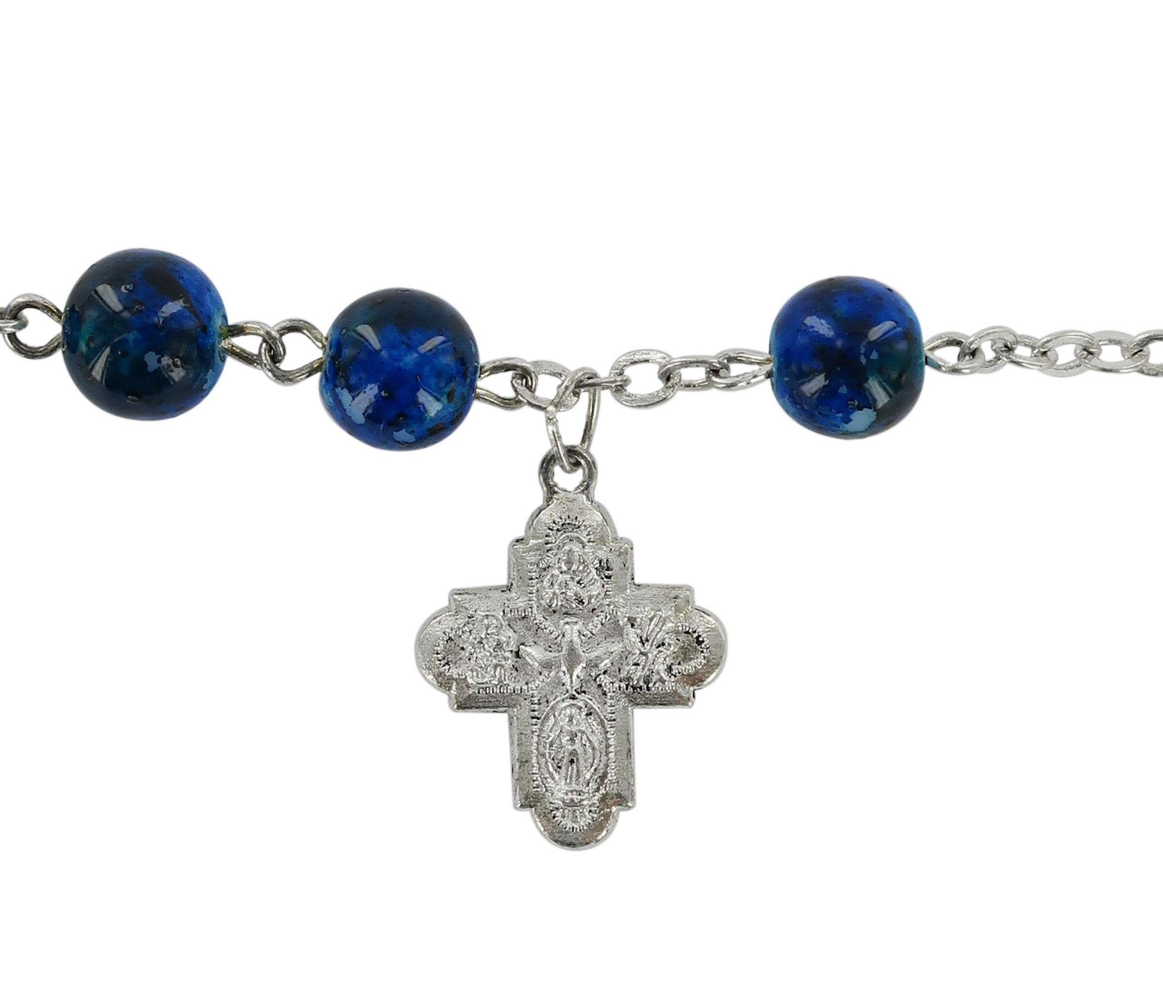 Braccialetto con palline in vetro maculato di diametro 8 mm di colore blu e croce di altezza 2 cm.