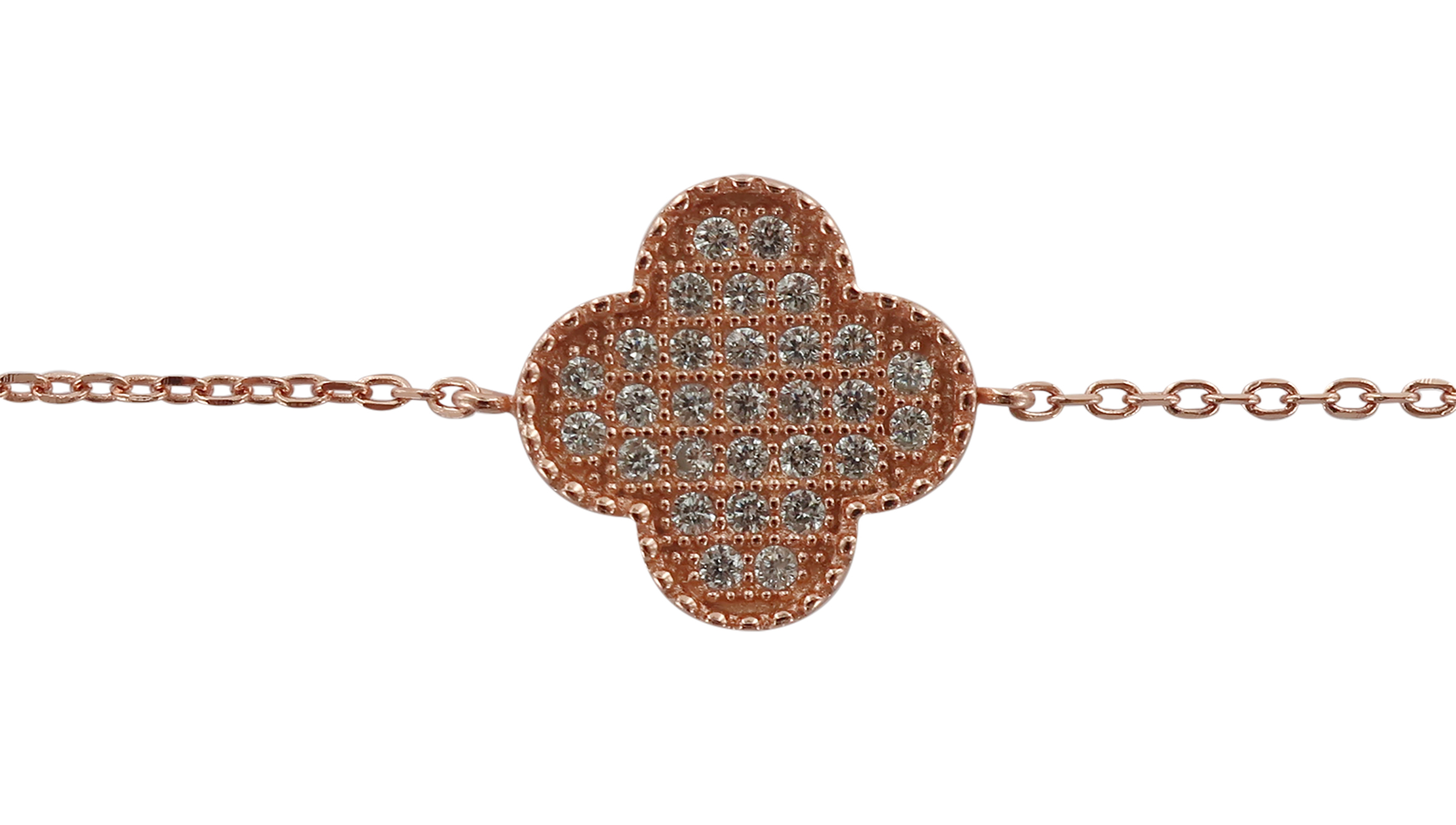 Il braccialetto si presenta con una semplice catena che ha nel centro un quadrifoglio con strass che misura cm 1,5.