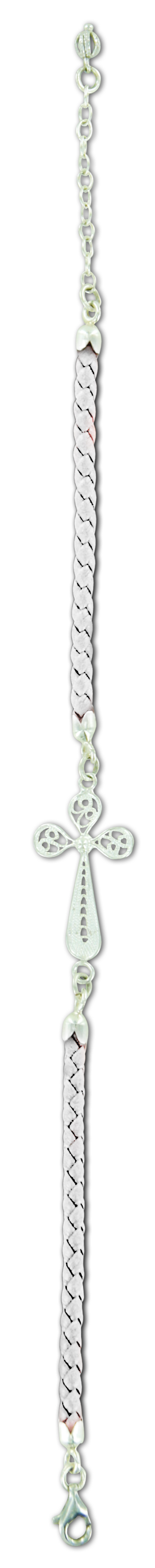 Questo bracciale è in ecopelle intrecciata di colore bianco con una croce in filigrana d'argento 925.
