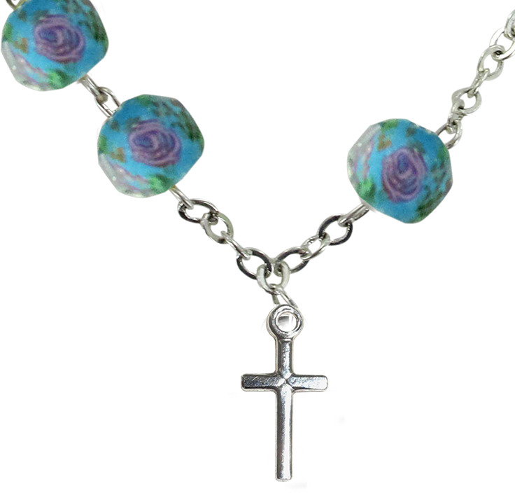 Braccialetto con grani in vetro pressato sfaccettato di colore azzurro con fiori rilegato in argento.