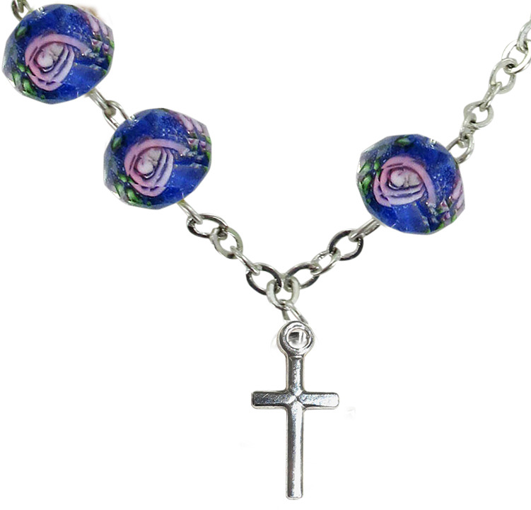 Braccialetto con grani in vetro pressato sfaccettato di colore blu con fiori rilegato in argento.