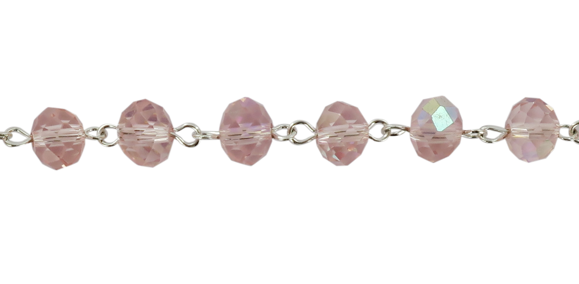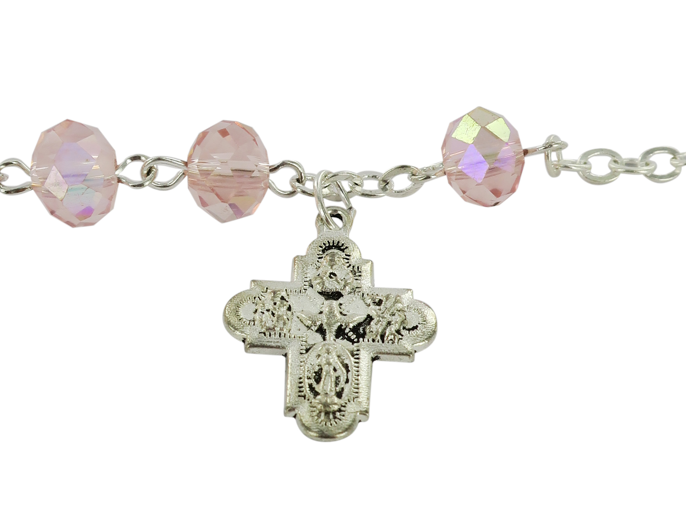 Braccialetto rosario con 11 grani in cristallo di colore rosa e croce di misura 2 cm.