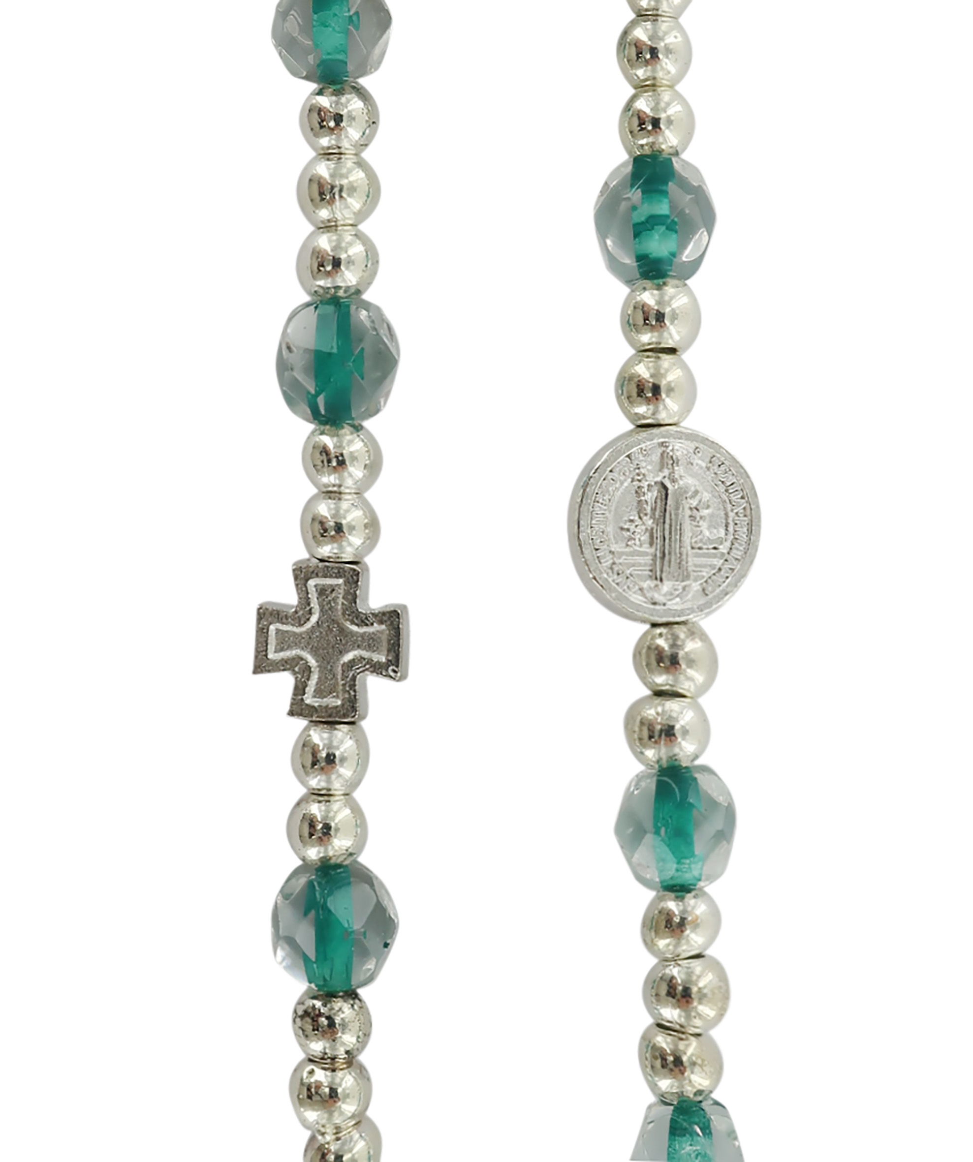 Braccialetto con sfere sfacettate in semicristallo e acciaio con medaglia e croce di San Benedetto dotata di