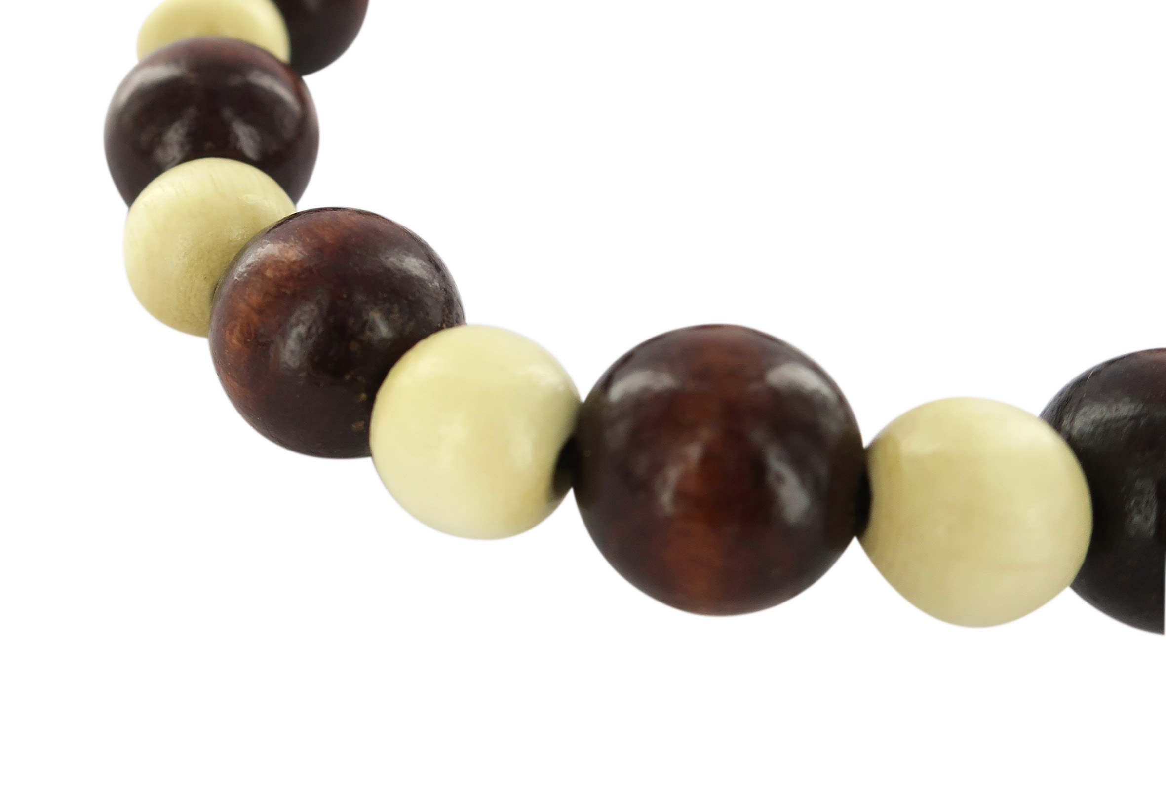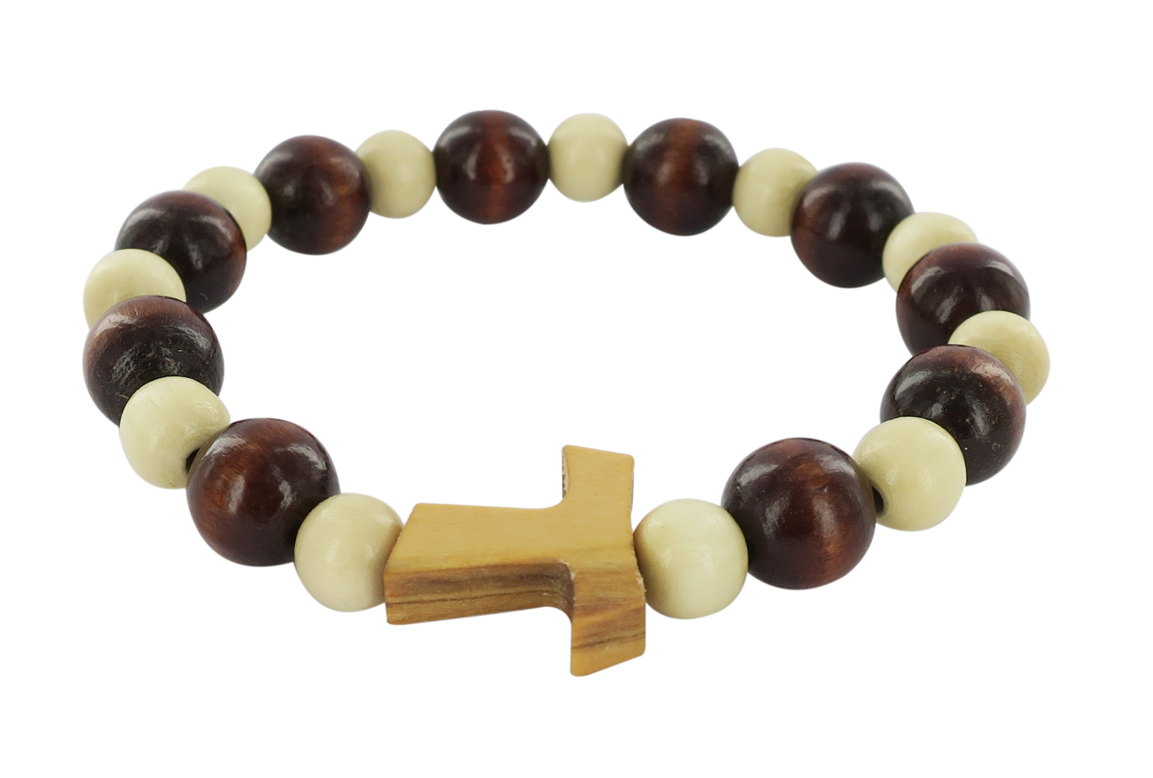 Braccialetto elastico con grani lucidi in legno a due colori alternati (marrone scuro e creme/beige). Include anche una croce Tau che non è inserita come pendente, ma aderisce al polso.