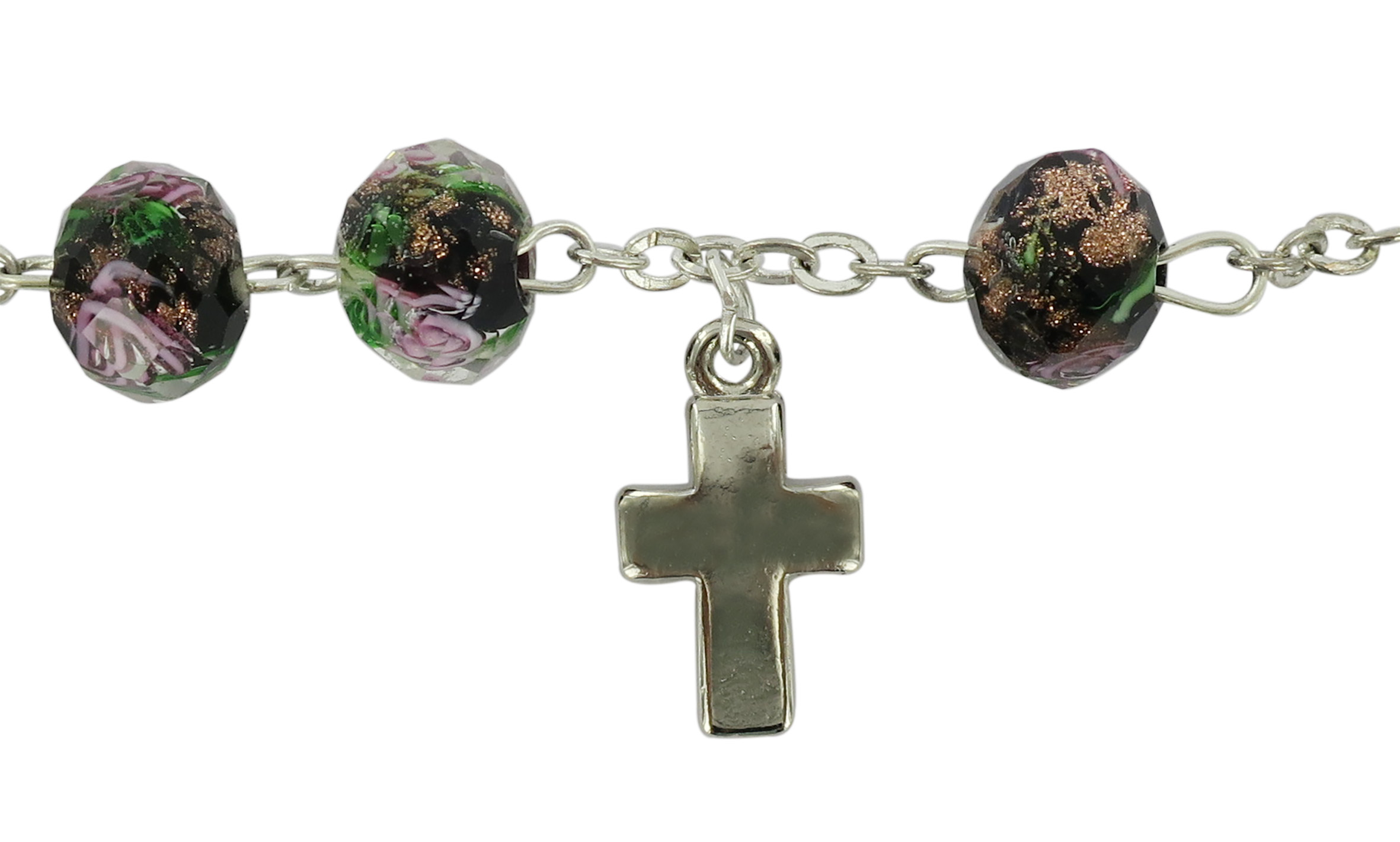 Braccialetto rosario con grani di diametro 7 mm in vetro sfaccettato di colore bianco con fiori di colore