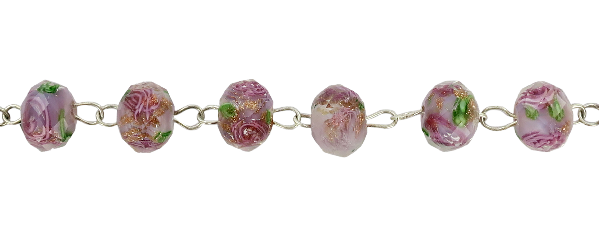 Braccialetto con grani di diametro 7 mm in vetro sfaccettato di colore viola/ametista con fiori di colore rosa.