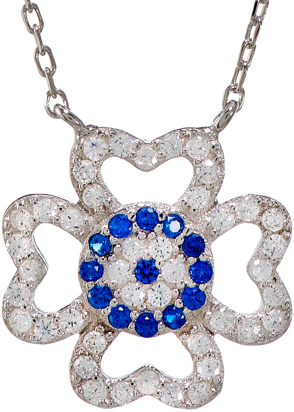 La collana è lunga cm 21 e si presenta con un quadrifoglio centrale con strass bianchi e blu.