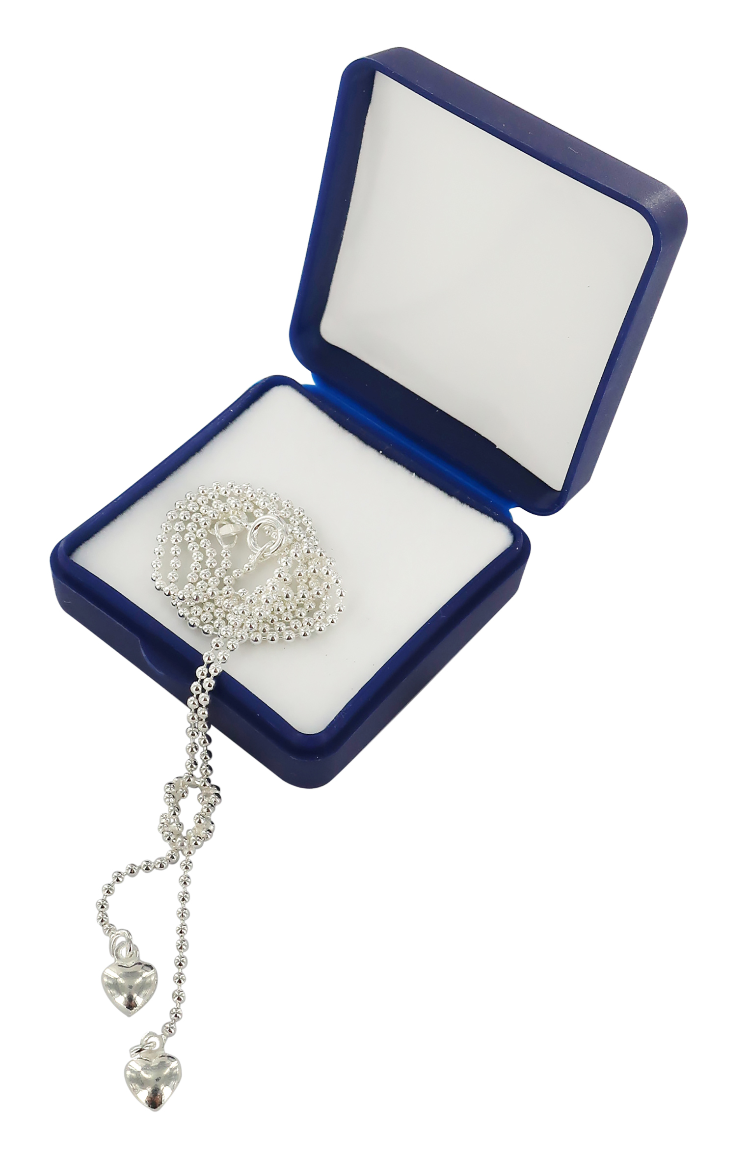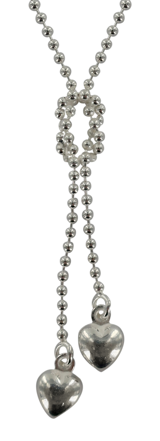 La catena della collana è formata da piccolissime palline che si intrecciano sul davanti e terminano con due piccoli cuori di mm 6.