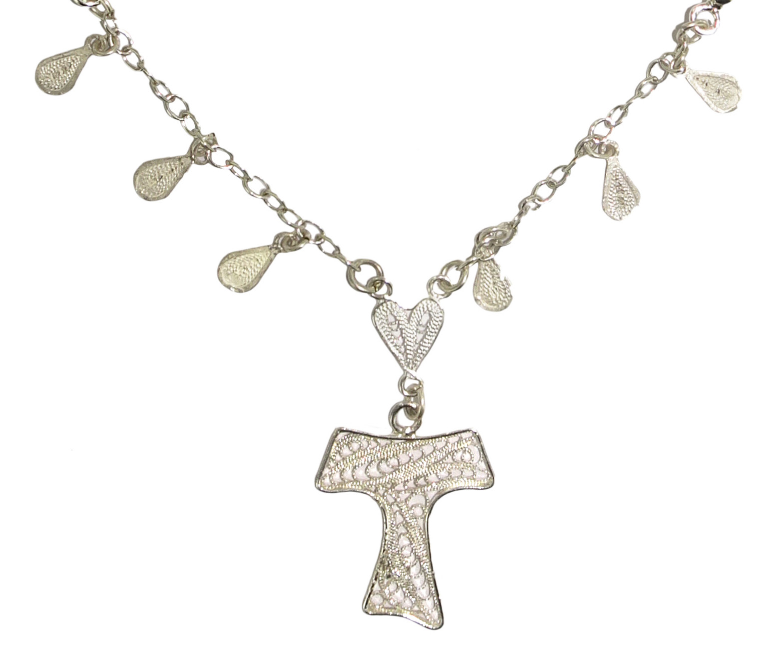 La croce tau cosi' come i ciondoli sono in filigrana ovvero realizzati con fili d'argento che si intrecciano all'interno della struttura sia della croce che dei pendenti,creando un elegante effetto traforato.