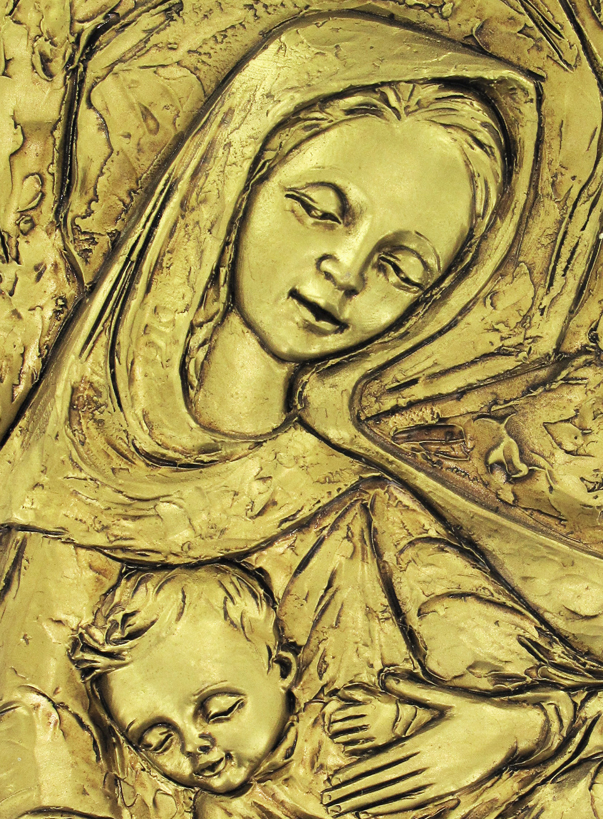 L'immagine è stata ideata dalla scultrice Suor Angelica e riprodotta su resina rettangolare dipinta a mano in oro brunito.