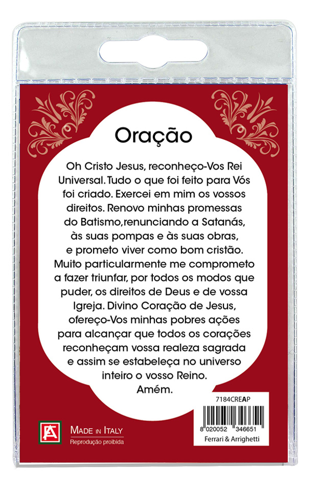 l blister si presenta con all'interno un cartoncino raffigurante il Cristo Rei riprodotto su una vetrata.