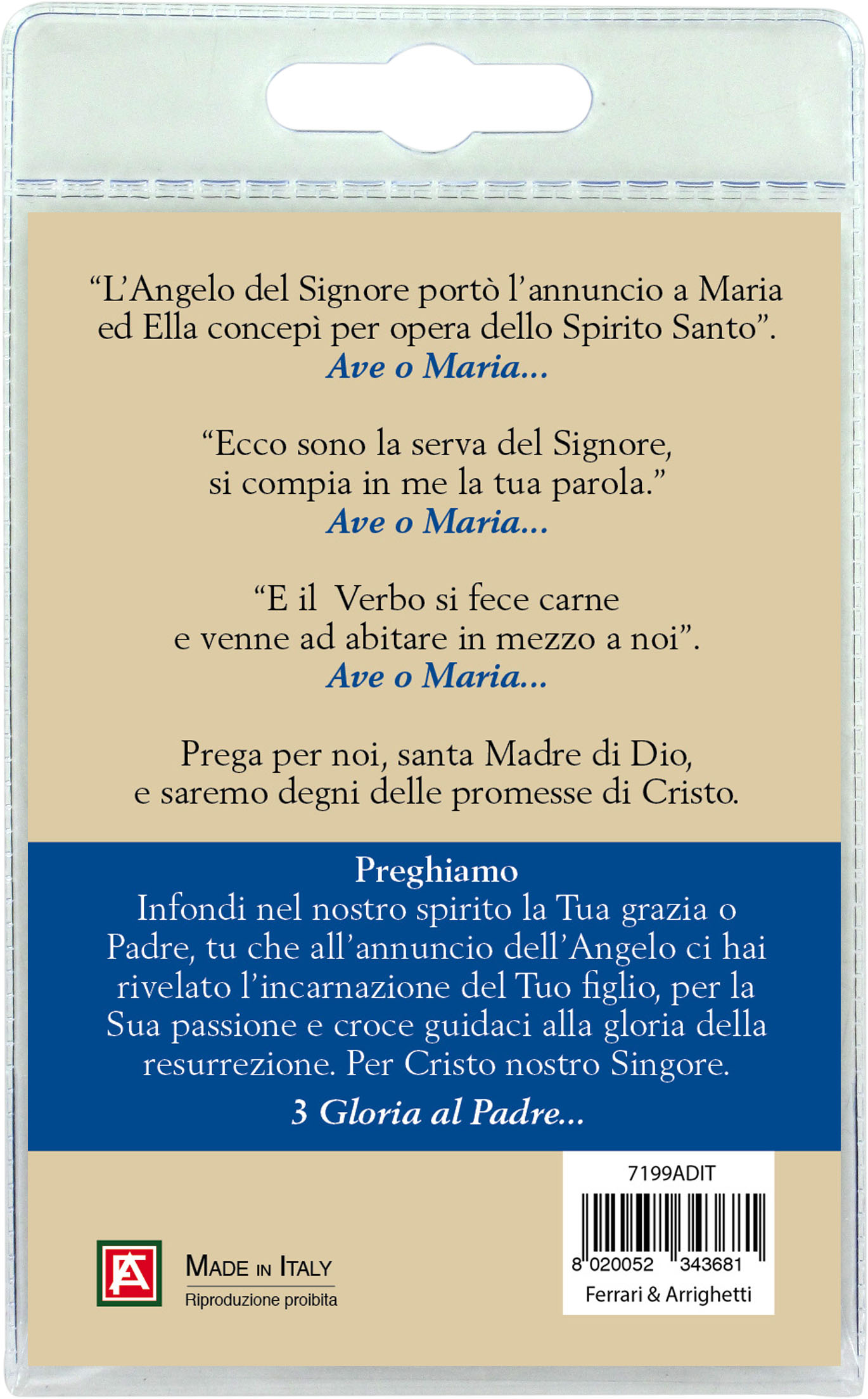 Il blister si presenta con all'interno un cartoncino, rappresentante l'immagine del Beato Angelico dell'Annunciazione a Maria Santissima.