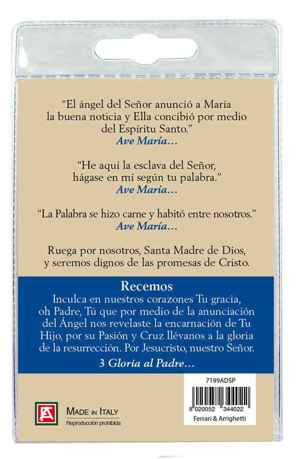 l blister si presenta con all'interno un cartoncino, rappresentante l'immagine del Beato Angelico dell'Annunciazione a Maria Santissima.